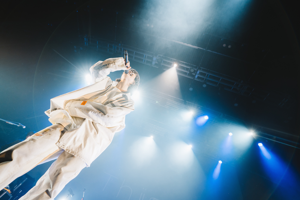 柔らかなミックスボイスを心地よく響かせ、自らの決意を今一度確かめるように一語一語丁寧にその“始まりの歌”を歌い切ると、ギターを手に取り、自身がかき鳴らす力強いギターのカッティングを合図に2曲目の「反論」へ。紗幕が落ち、先ほどとは一転してパワフルなバンドサウンドを轟かせながら一気にトップギアに持っていく。<もしも君の大切な人が明日紅く散ったとしたら/時を戻せやしない事 そのくらいはもうわかるだろ?/全全全部ぶっ飛ばして 己の音 掻き鳴らして行け>——歌詞に託した想いを全身で表すように、激情的に歌い叫ぶ姿に惹きつけられる。その勢いをさらに加速させるようにして、「生命の証明」、「誰より何でしょ 人より事よ」と、他の誰でもない、自分自身の手で人生を大きく動かし始めた彼の根底にある意志を歌い鳴らす楽曲を続けざまに披露。映秀。自身が震源となってステージ上からダイナミックに放たれていく音楽のエネルギーが、あっという間にフロアを掌握していく。