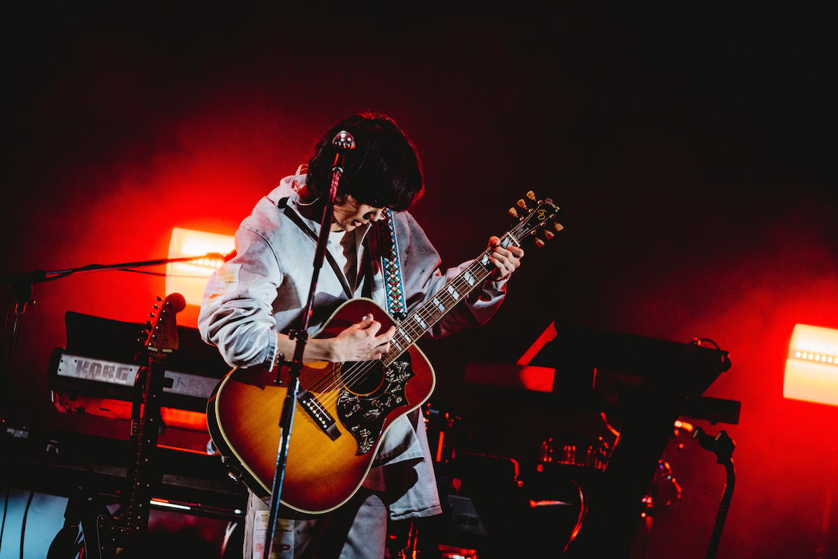 ハンドマイクで自由に音の波に乗り、自分を見失いそうになる弱さや葛藤を吐露する一方で、生きることの歓びを音階やリズムに託した多幸感溢れるサウンドスケープの中で解き放たれるように歌い上げた「第弐ボタン」、「失敗は間違いじゃない」の眩いエネルギー。心地よく横にスウィングするリズムに身を揺らし、客席からのハンドクラップもその音楽の一部に取り込みながら美しい歌声を響かせた「砂時計」の、過ぎゆく時にひとり佇む寂寥の中に確かなぬくもりを感じさせる表現。スパニッシュなギターが耳を引くイントロに始まり、ファットなベースラインが生み出すグルーヴに乗ってラップを披露しながら、混迷極まる時代に対する失望と憤りを吐き出すように歌った「諦めた英雄」の、当事者として社会に問いかけていく目線——。