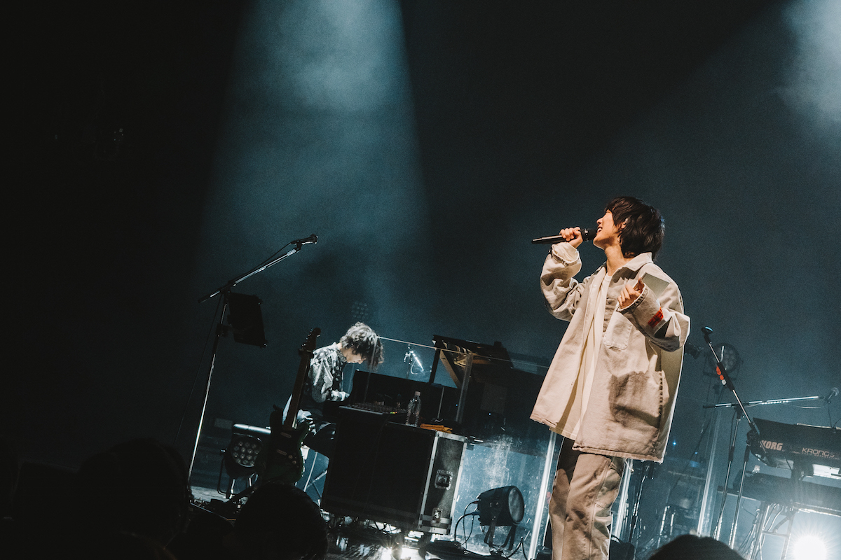 最後は、2年前のこの日に癌で亡くなったという父親への想いを重ね、特別に角野の奏でるピアノと共に「Good-bye Good-night」を歌い鳴らし、この夜を締め括った。<半世紀燃えた命の灯火を忘れぬように/五線譜に書き込んでいる><半世紀燃えた命の灯火はまだ鮮明に/音として今燃えている>——静かに、けれど万感の想いを込めて歌われたこのフレーズは、彼が父親に捧げたレクイエムであると同時に、この日のライブを観た後だからこそ、映秀。のアーティスト人生の始まりを示すものとして確かな説得力をもって、とても美しく響いた。彼がこれからどんな生をその音楽に記していくのか、より一層楽しみになる一夜だった。
