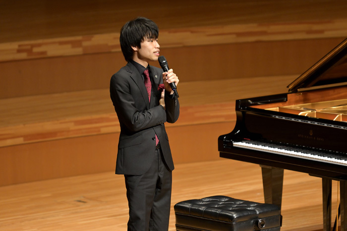 「このダサい曲(アンコール一曲目で演奏した作品のこと)は何だろうと思われたのではと想像していますが、 二つのブーレ というショパンの晩年の作品です。晩年、ショパンは意外にも駄作といわれる作品を数曲生みだしているのですが、僕にとっては、このような作品ですら演奏したくなってしまうほど、ショパンという人間、その人に魅力を感じています。これからもショパンの作品をずっと引き続けていきたいと思っています」
