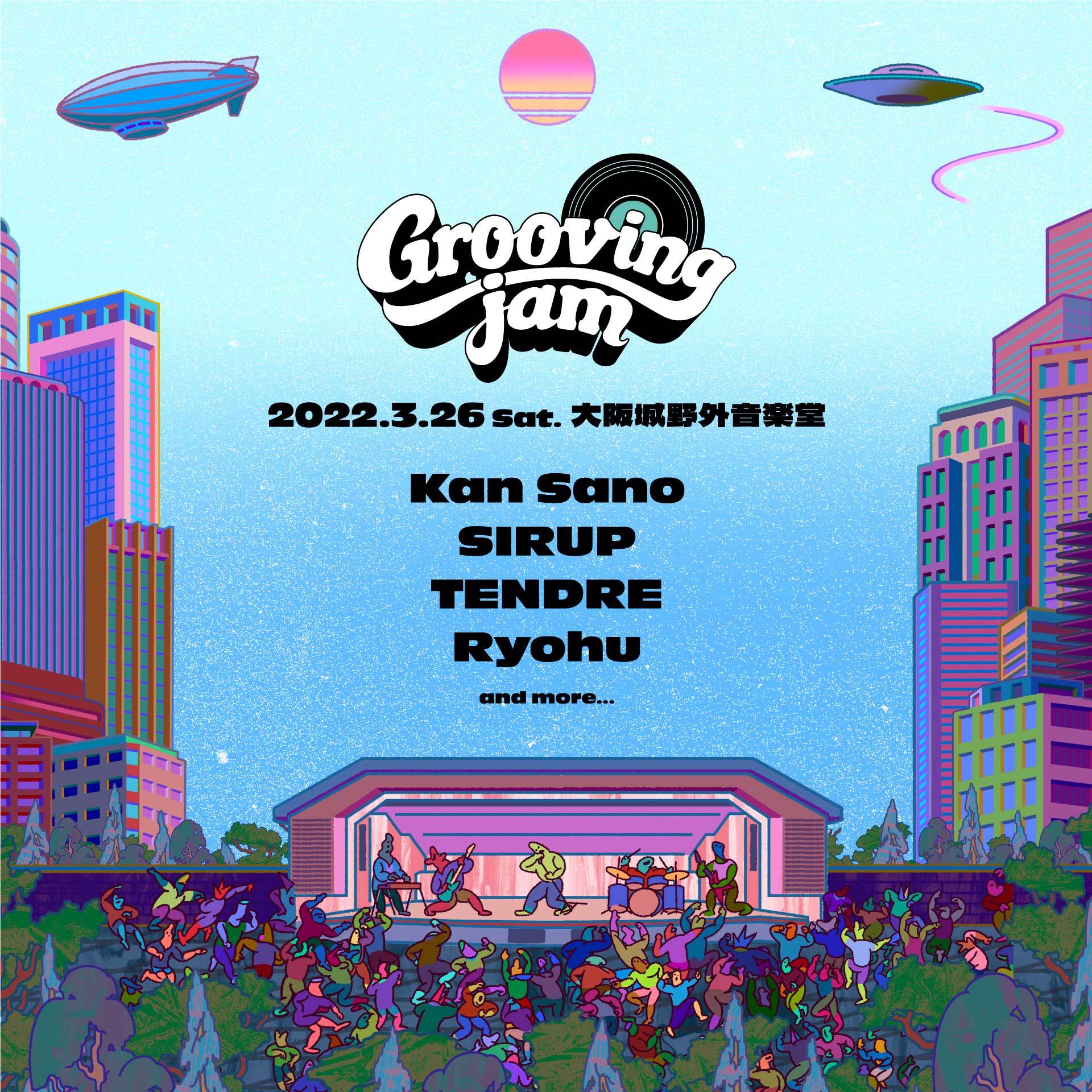 音楽だけでなく、ファッションと食も一挙に楽しめる新たな野外フェスティバル『Grooving jam』が、3月26日(土)に大阪城野外音楽堂にて開催決定。第1弾出演アーティストとしてKan Sano、SIRUP、TENDRE、Ryohuの出演が発表された。