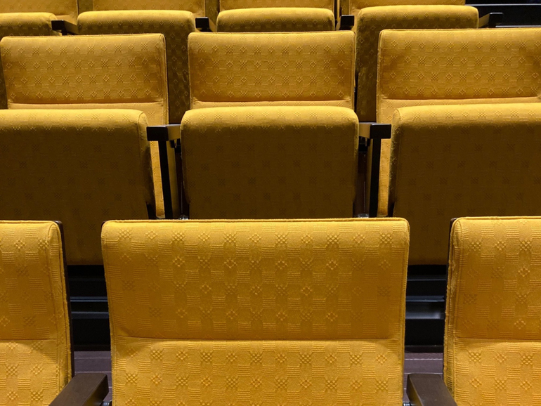 大劇場(約1600席)はブルーを基調とした座席や天井を配した空間で、美しい海の中をイメージしている。一方、小劇場(約260席)は「首里城の軒先」をコンセプトに、かつて王族が着こなした着物をイメージした黄色を座席に使い、また壁に施された独特の模様が間接照明により透かし模様のように浮かび上がる。劇場としてはあまり見たことがない華やかなデザインが、空間に入っただけで気分を上げさせる。大小スタジオ、練習室もロビーからも覗けるようになっていて開放的だ。