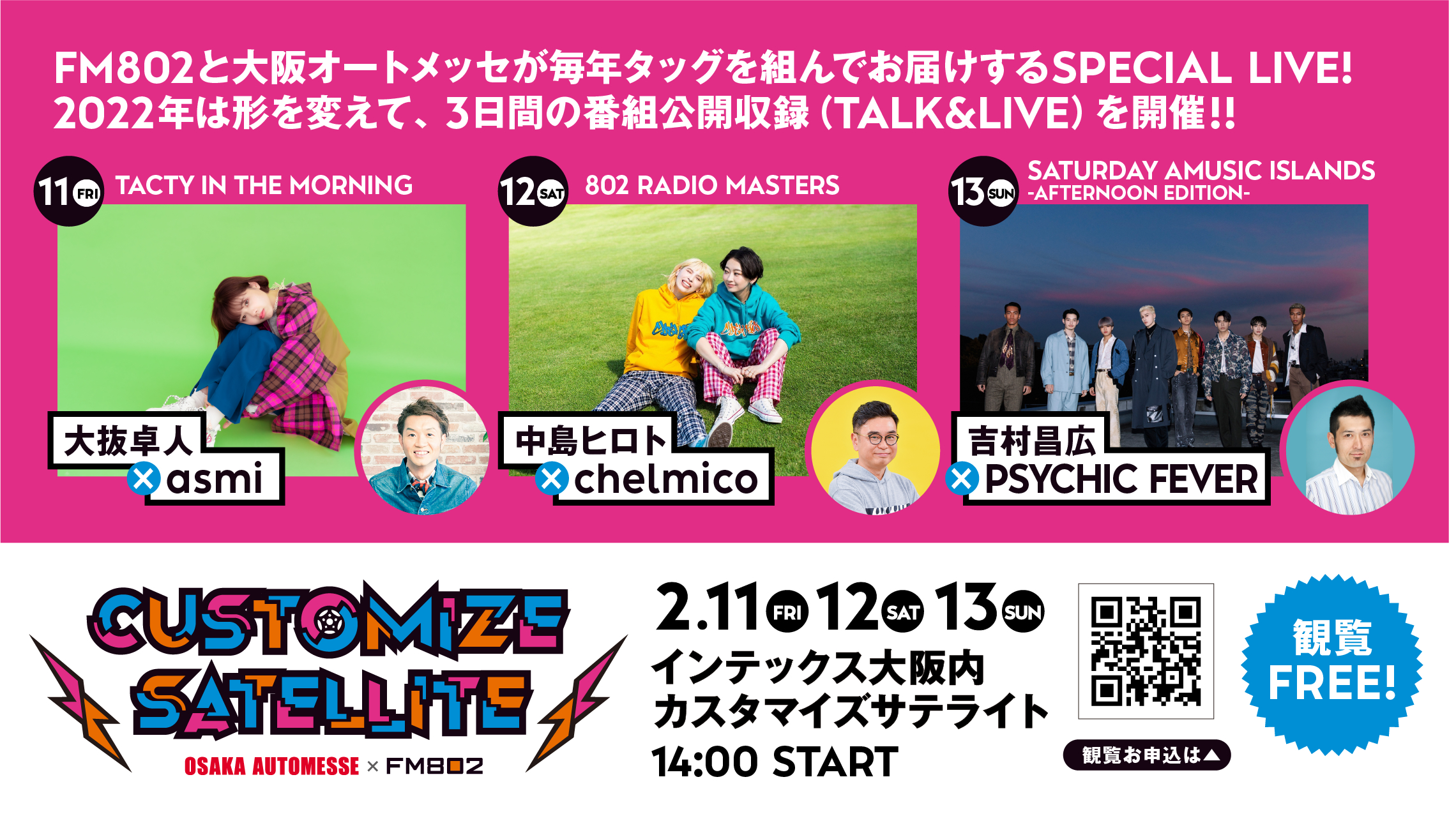 『オートメッセ』とFM802は例年、タッグを組んでインテックスプラザにてスペシャルライブステージ「CUSTOMIZE ARENA」を展開していた。2022年は形を変えて、同会場内カスタマイズサテライトにてFM802番組の公開収録が行われる。11日(金)にasmiと『TACTY IN THE MORNING』からDJ大抜卓人、12日(土)にchelmicoと『802 RADIO MASTERS』からDJ中島ヒロト、13日(日)にPSYCHIC FEVERと『SATURDAY AMUSIC ISLANDS-AFTERNOON EDITION-』からDJ吉村昌広が出演する。