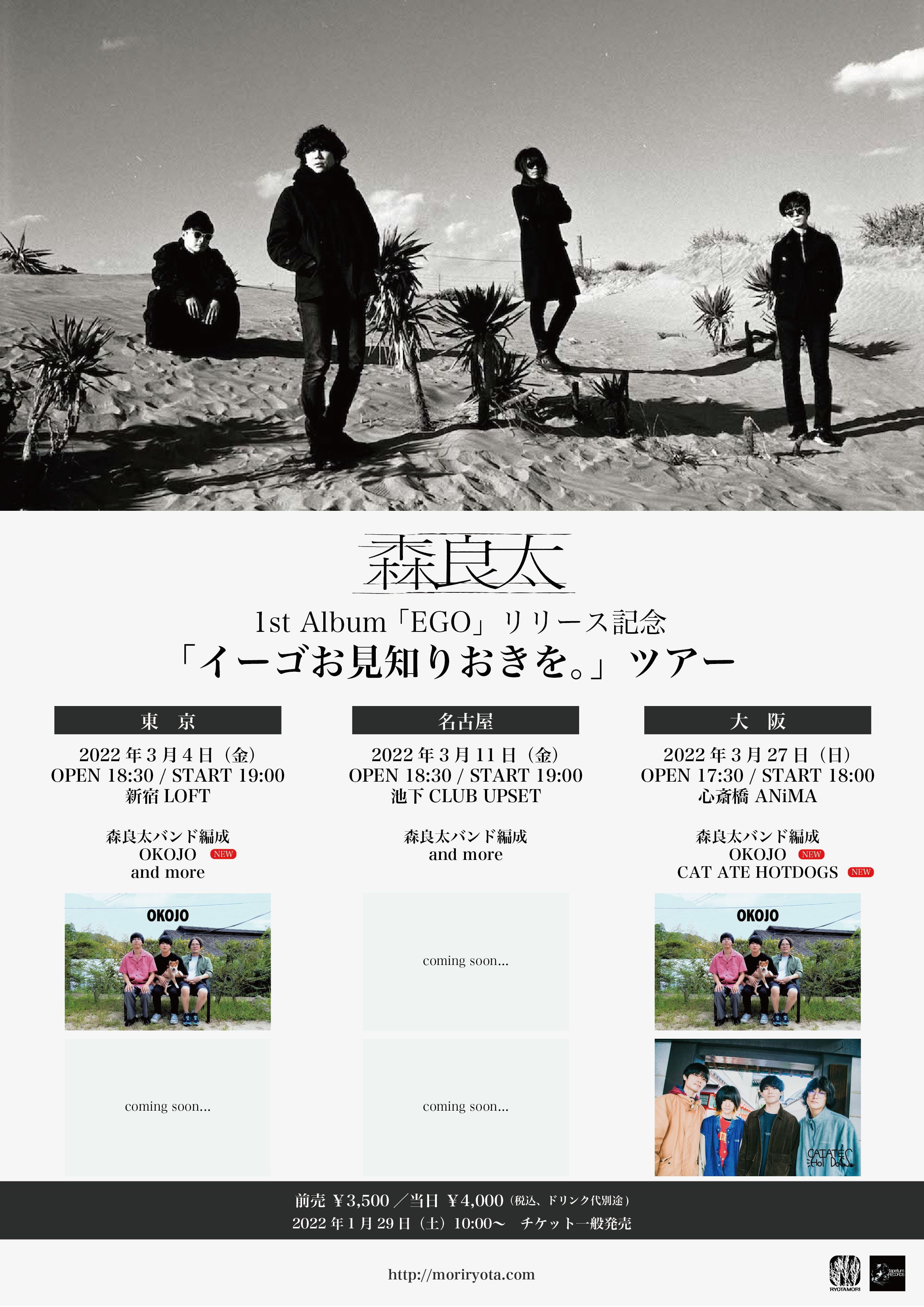 そして、本作のリリースを記念して開催される東名阪ツアーの第1弾アーティストとして、3月4日(金)の東京・新宿LOFTにOKOJO、3月27日(日)大阪・心斎橋ANiMAにはCAT ATE HOTDOGSとOKOJOの出演が決定。東京公演の残り1組と、3月11日(金)名古屋・池下CLUB UPSETの出演者は2月中旬ごろの発表を予定している。