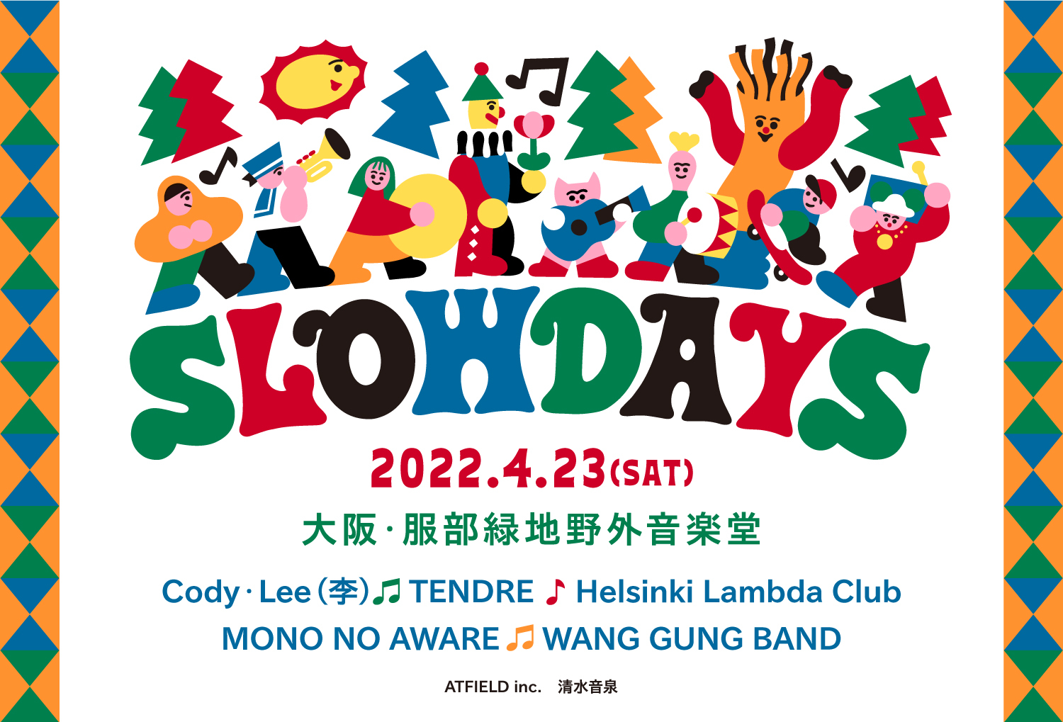 近郊型ゆるフェス『SLOW DAYS』が4月23日(土)に、大阪の服部緑地野外音楽堂にて開催されることが決定した。出演はCody・Lee(李)、TENDRE、Helsinki Lambda Club、MONO NO AWARE、WANG GUNG BANDの5組。