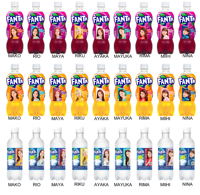 今回、限定デザインボトルが発売されるのは「ファンタ グレープ」「ファンタ オレンジ」「ファンタ ヨーグルラッシュ」の3種のフレーバー。メンバーごとに異なる9種類のデザインが各フレーバーで展開される。