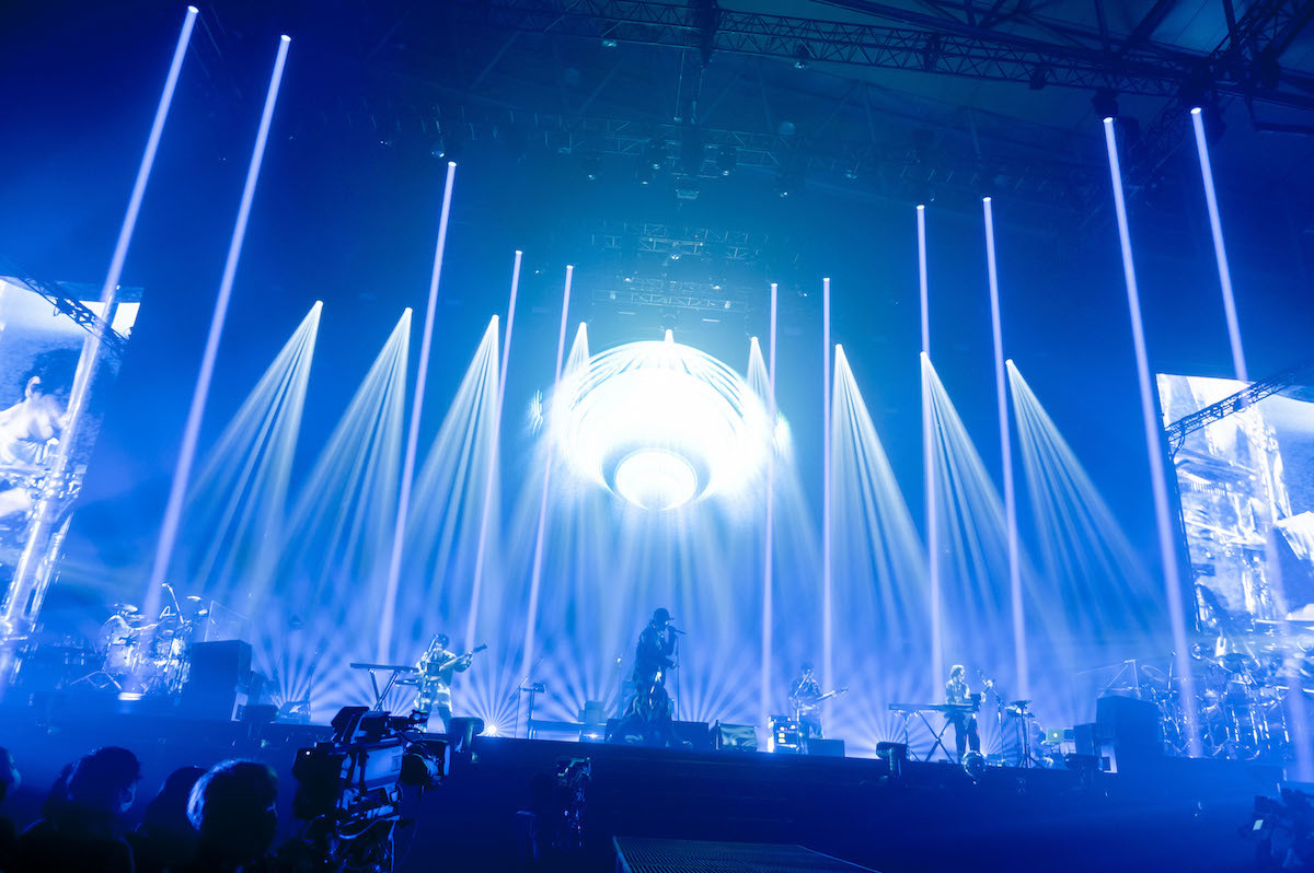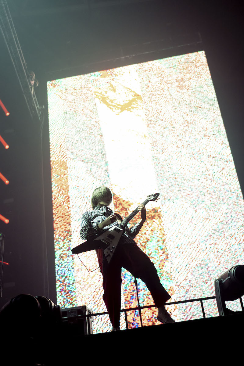 この日を待ち侘びたオーディエンスの期待感が、開演を告げるSEとともに一面の手拍子へと姿を変える。そして、激しく明滅する光線以上に目映い「TWILIGHT」のサウンドスケープが、客席をジャンプの波へと導いていく。さらに『FOREVER DAZE』からもう1曲、野田がギターを構えてエモーショナルに響かせたのは「桃源郷」。野田洋次郎と武田祐介(Ba/Cho)、リズムを支えるサポートドラム・森瑞希&エノマサフミ、さらに今回のツアーから新たに参加したTAIKING(Gt・Suchmos)、沙田瑞紀(Gt/Key/Chorus・miida)の姿が次々に巨大ビジョンに映し出され、「RADWIMPSです! 始まったよ!」という野田のコールとともに場内の祝祭感は刻一刻と高まっていく。