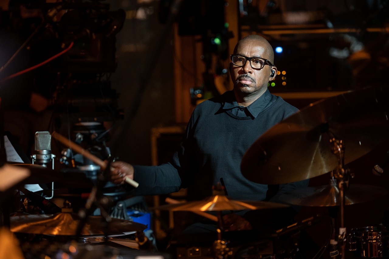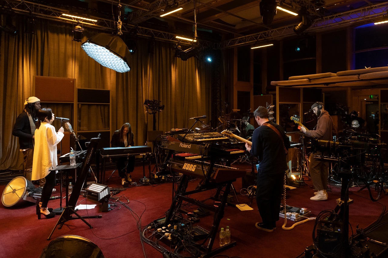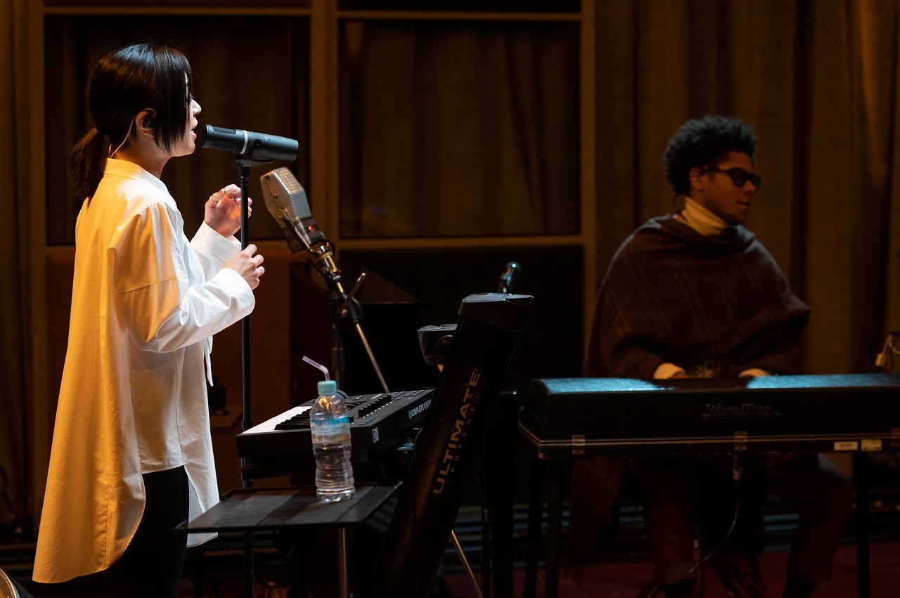 バンマスのベーシスト、ジョディ・ミリナー(Jodi Milliner)をはじめとする7名のサポートミュージシャンらと共に、宇多田がスタジオに足を踏み入れるシーンからライブははじまった。白いシャツに黒いパンツというカジュアルな服装。マイクの前に立った宇多田はぐっと体を伸ばし、肩をまわした。「キー、キー、キー」と少しおどけるように発声をすると、スタジオに笑顔がこぼれた。1曲目はアルバムのオープニングトラック「BADモード」。トライバルなビートと柔らかなシンセのフレーズ、渋いサックスの調べにのせて、宇多田の儚くも透明感のあるボーカルが軽やかに転がった。《絶好調でもBADモードでも/君に会いたい》。アルバムの核心とも言えるフレーズが心地よく伝わってくる。シンセの音色がリズム楽器のように緻密に重なり合い、極上のグルーヴを聴かせた映画『シン・エヴァンゲリオン劇場版』テーマソング「One Last Kiss」、切ないピアノのイントロを皮切りに低音域から高音域へとレンジの広い歌唱を聴かせるドラマ『最愛』の主題歌「君に夢中」へ。時々目を閉じ、演奏に身を委ねるようにして、宇多田はゆるやかに体を揺らしながらメロディを紡いでいく。