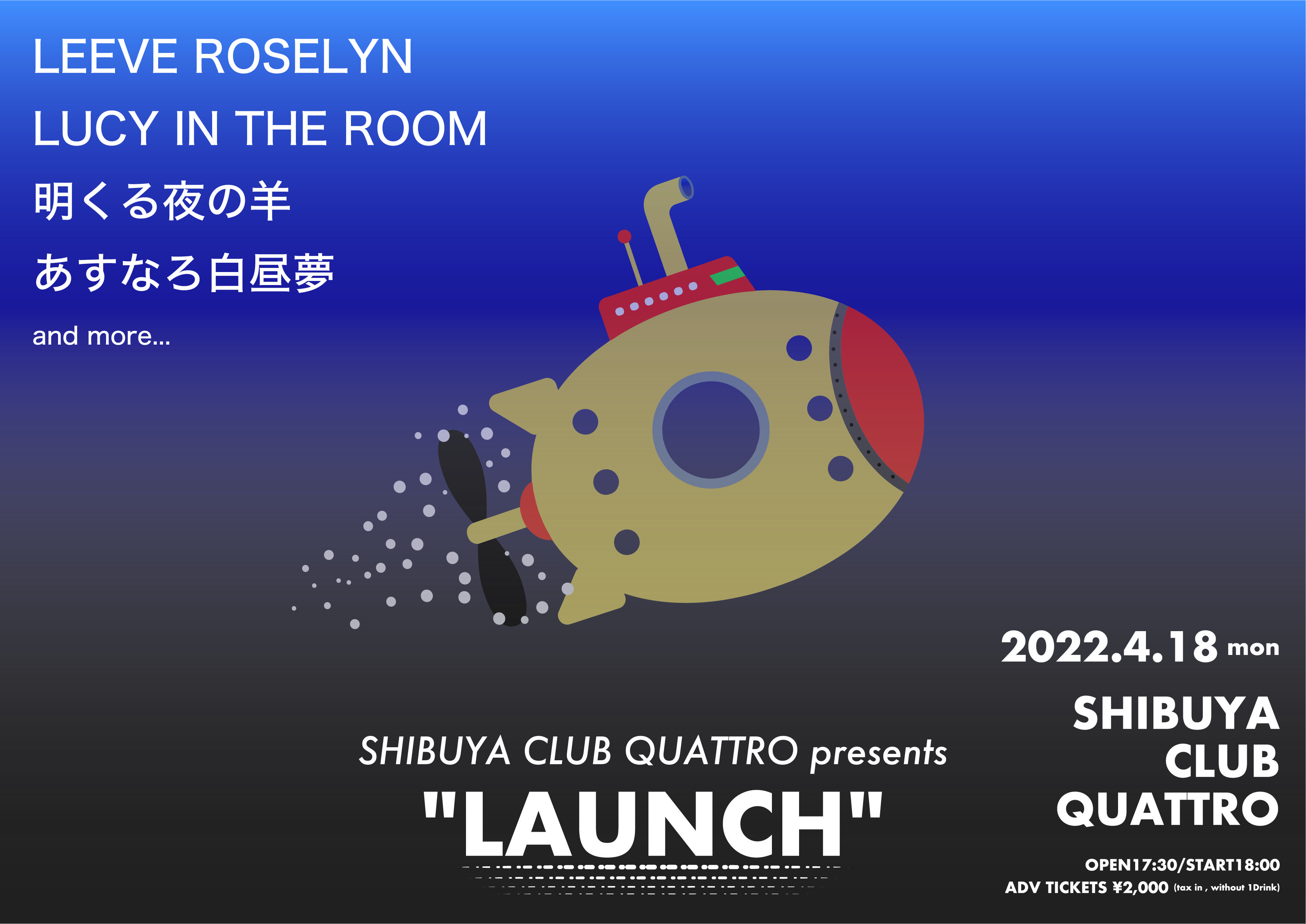 渋谷クラブクアトロが企画する対バンイベント『LAUNCH』。コロナ禍で制限されてしまった音楽シーンからあらためて「ローンチ」していって欲しい次世代アーティストを迎えて開催する対バンシリーズ。第2回目の今回は 、明くる夜の羊、 LEEVE ROSELYN、あすなろ白昼夢 、LUCY IN THE ROOMら4組の出演が決定している。