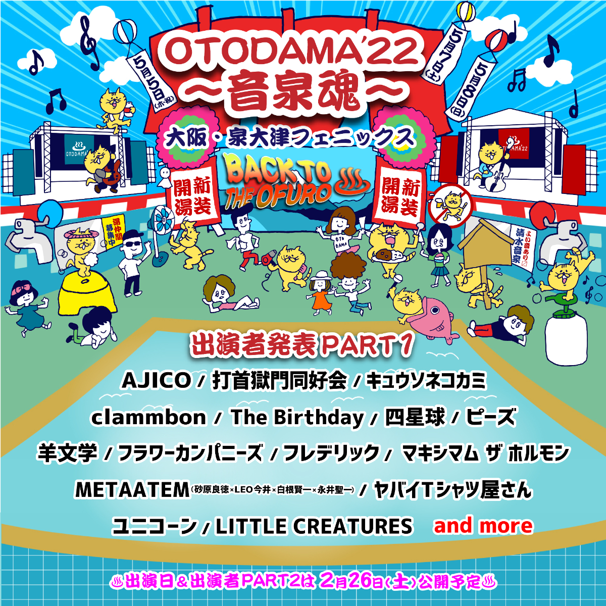 今回出演がアナウンスされたのは、AJICO、打首獄門同好会、キュウソネコカミ、clammbon、The Birthday、四星球、ピーズ、羊文学、フラワーカンパニーズ、フレデリック、マキシマム ザ ホルモン、METAATEM(砂原良徳×LEO今井×白根賢一×永井聖一)、ヤバイTシャツ屋さん、ユニコーン、LITTLE CREATURESの15組。