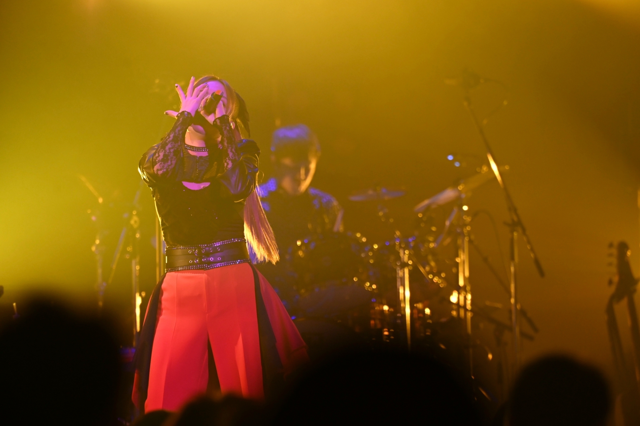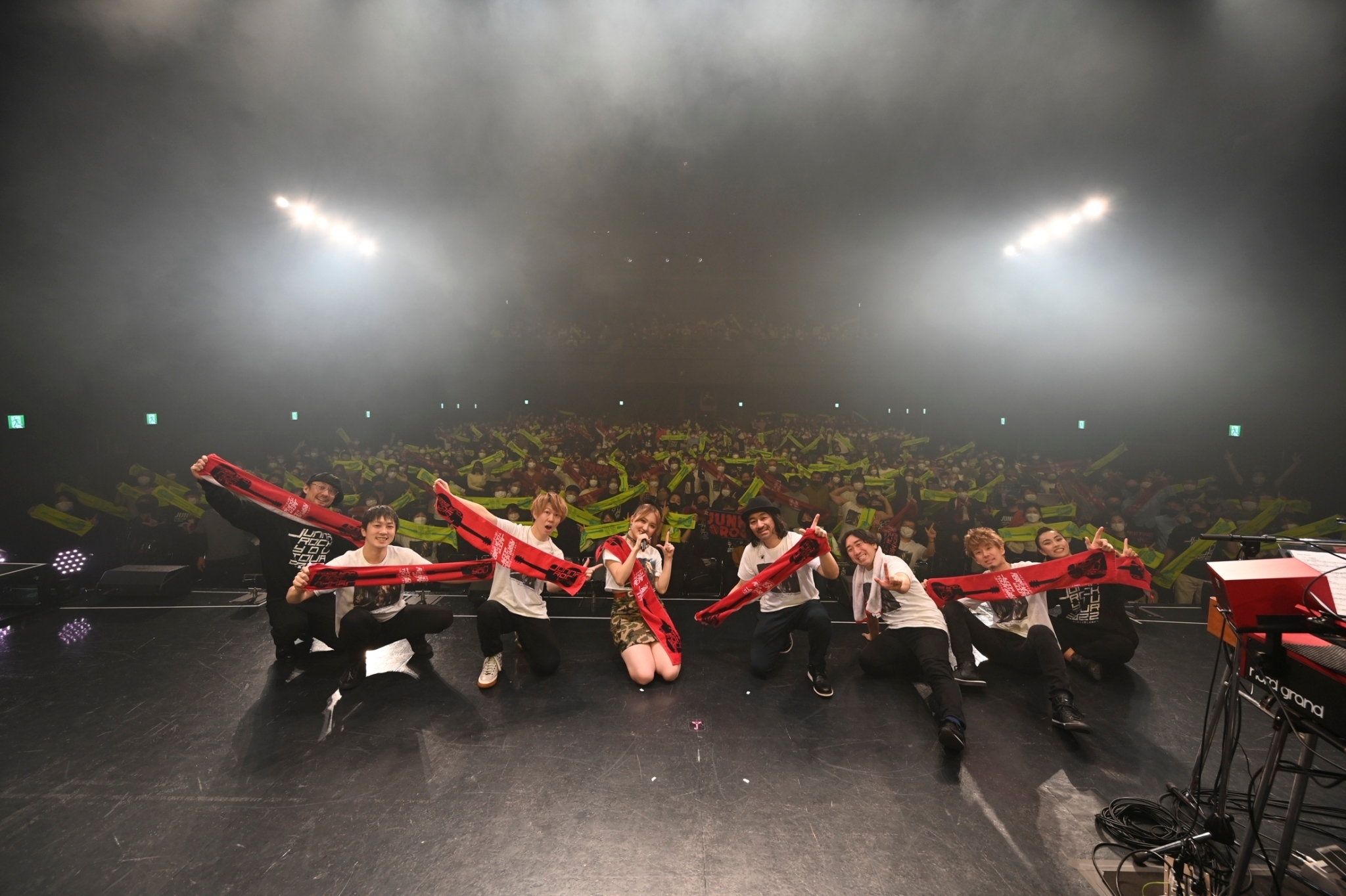 「まだまだ行けますか!」と言ったものの次に披露されたのは「You + Me = ? 」というタイトルの冒頭から明るく弾けるパンキッシュなナンバー。JUNNAが事前のインタビューで「私のライブでは説明もないまま唐突に新曲を披露してそのままやり逃げするようなことがこれまでもあったかと思いますが(笑)、それを今回もやるんじゃないかな~」と告知していたが、この曲がまさにそれ!しかし「この曲なんだっけ?」などと思っている暇などなく、ステージ上ではバンドのメンバーが集まって頭を振りながら演奏しており、そこにJUNNAも加わったりとロックな展開!オーディエンスも手を大きく振り上げる動きで、見事な一体感がたちまち生まれていたのは、さすが。