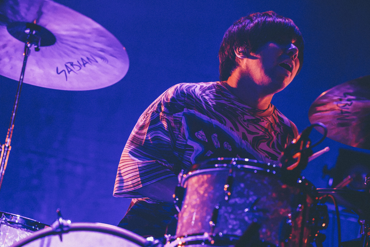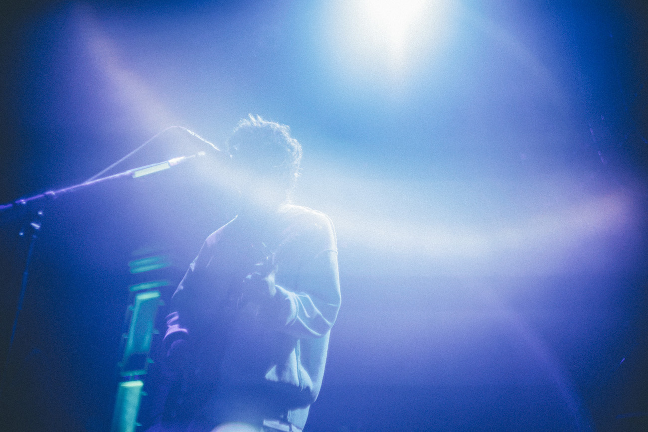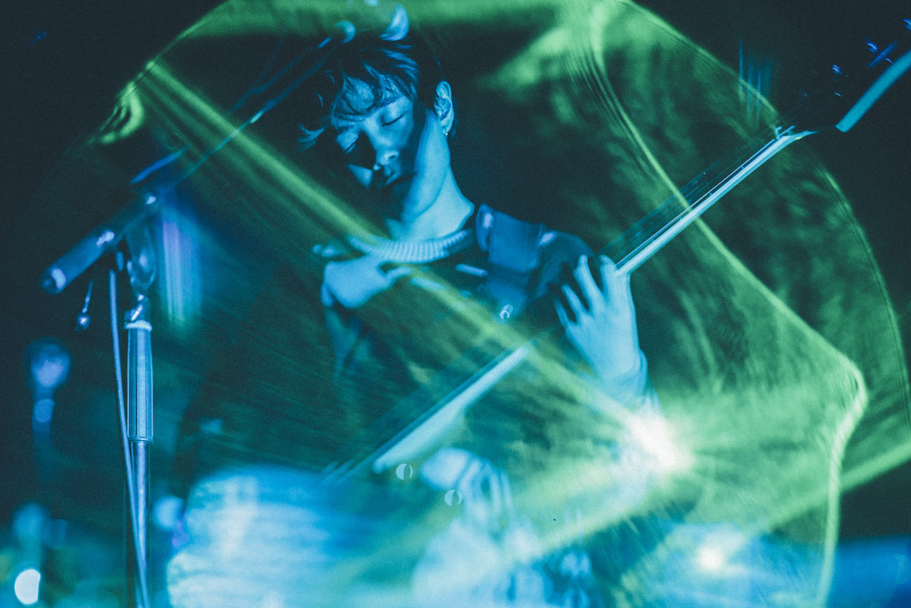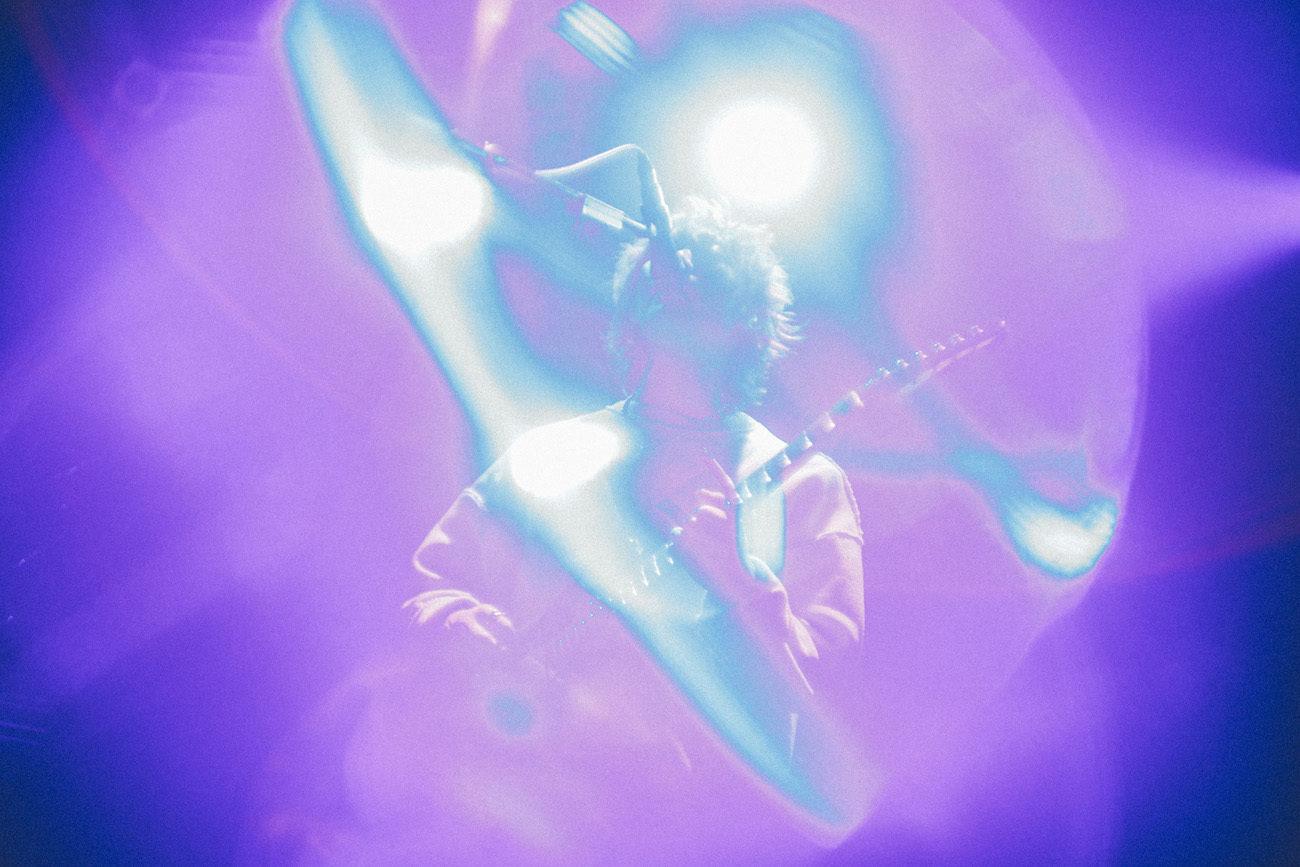 最初に登場したのは、2マン形式の対バンイベント出演自体が今回初体験という須田景凪。サポートメンバーのモリシー(Guitar/Awesome City Club)、雲丹亀卓人(Bass)、矢尾拓也(Drums/Nanakamba)との4ピース編成で舞台に立った須田。まずはメジャー1stアルバム『Billow』から、ミディアムテンポのナンバー「MOIL」をハンドマイクで熱唱、オーディエンスの期待感とギアを合わせてみせる。そこから一転、ギターを構えて「veil」のアッパーな疾走感で会場一面のクラップを呼び起こしたところで、さらにフィードバックノイズから流れ込んだ「レド」のロックンロール感が、ライブ空間を刻一刻と高揚させていく。
