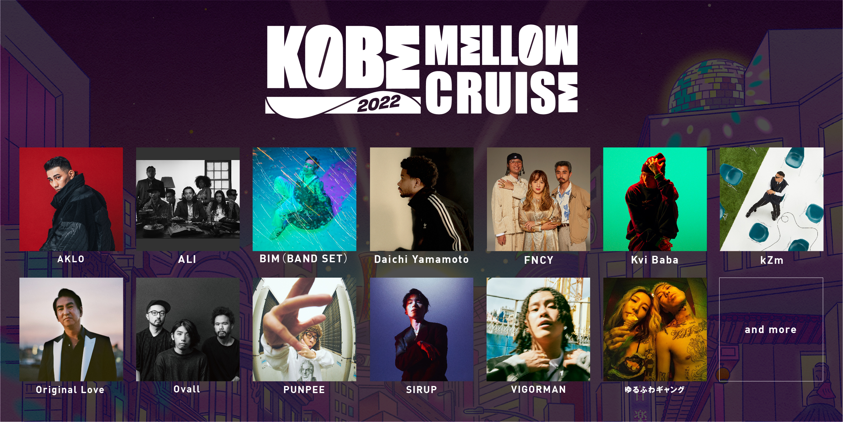 2022年5月28日(土)、5月29日(日)の2日間、神戸メリケンパーク内の特設会場にて音楽フェス『KOBE MELLOW CRUISE 2022』の開催が決定。第1弾アーティストとして、AKLO、ALI、BIM(BAND SET)、Daichi Yamamoto、FNCY、Kvi Baba、kZm、Original Love、Ovall、PUNPEE、SIRUP、VIGORMAN、ゆるふわギャングの13組の出演が発表された。