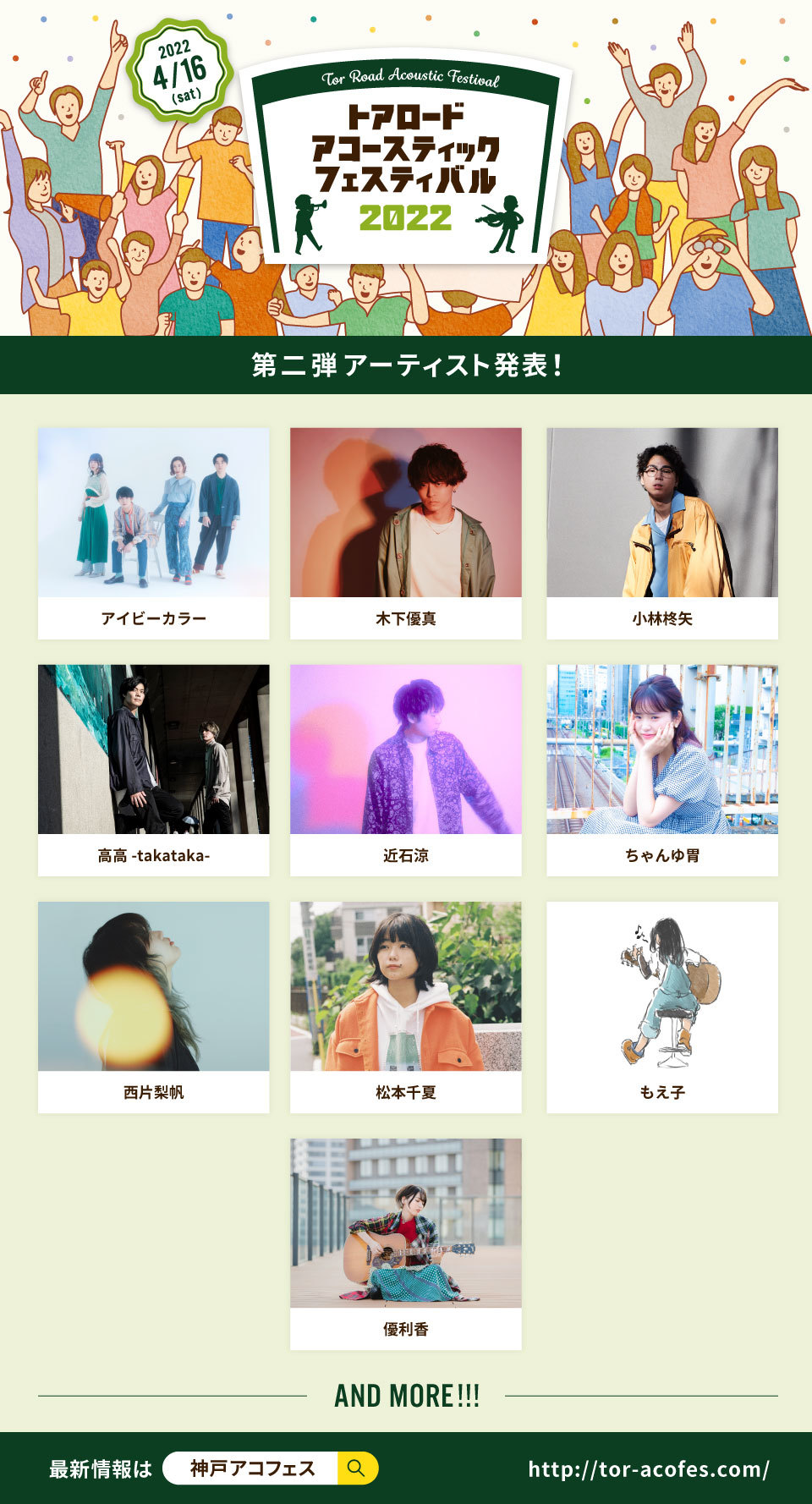 Kiss FM KOBEが主催するライブサーキットイベント『トアロード・アコースティック・フェスティバル2022』。4月16日(土)に開催する同イベントの第二弾出演アーティストが発表された。