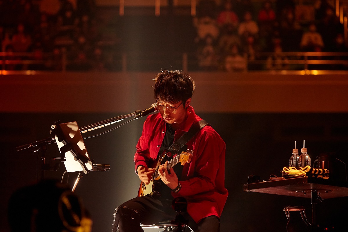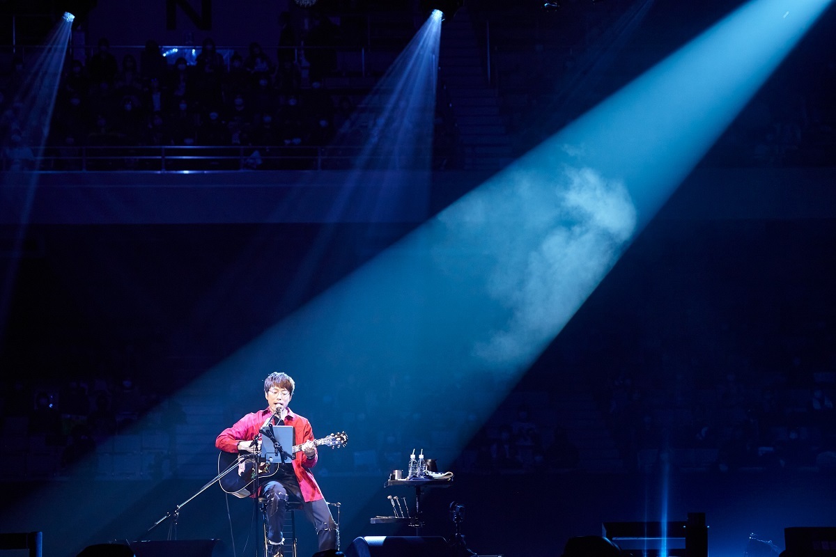 随所に挟まれるMCも、弾き語りならではの、少し長めで個人的な内容が楽しい。先日の、東京では珍しい降雪の際に“こういう歩き方したほうが安全”というツイートをしただけで“北から目線”“北国マウント”と言われて、そんなつもりはなかったという話から「いいひと」へつなぐ流れも秀逸だ。“笑顔の中の真顔”を下から照らすライトで強調して、笑いを誘いながらもやはり怖いという演出が見事だ。