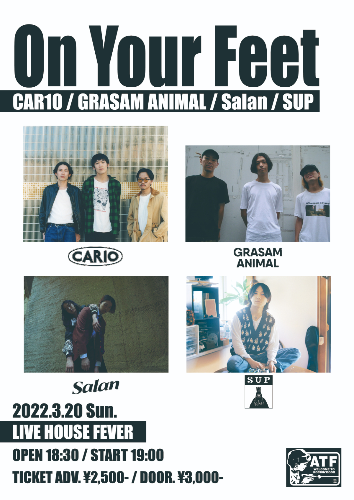 栃木県足利市を拠点に活動する3人組、CAR10。昨年9月より活動を再開した、GRASAM ANIMAL。昨年結成された2人組バンド、Salan。伊織(Vo/Gt)のソロプロジェクトとなるSUPの4組が出演となるイベント『On Your Feet』が、3月20日(日)FEVERにて開催される。主催は『BAYCAMP』などを手掛けるエイティーフィールド。