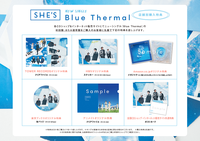さらに、7th Single「Blue Thermal」の各店舗ごとに購入特典のデザインも一挙公開。SHE’Sのアーティスト写真をメインに据えたものやオリジナルイラストが配置されたものなど、それぞれ魅力的な特典が用意されている。