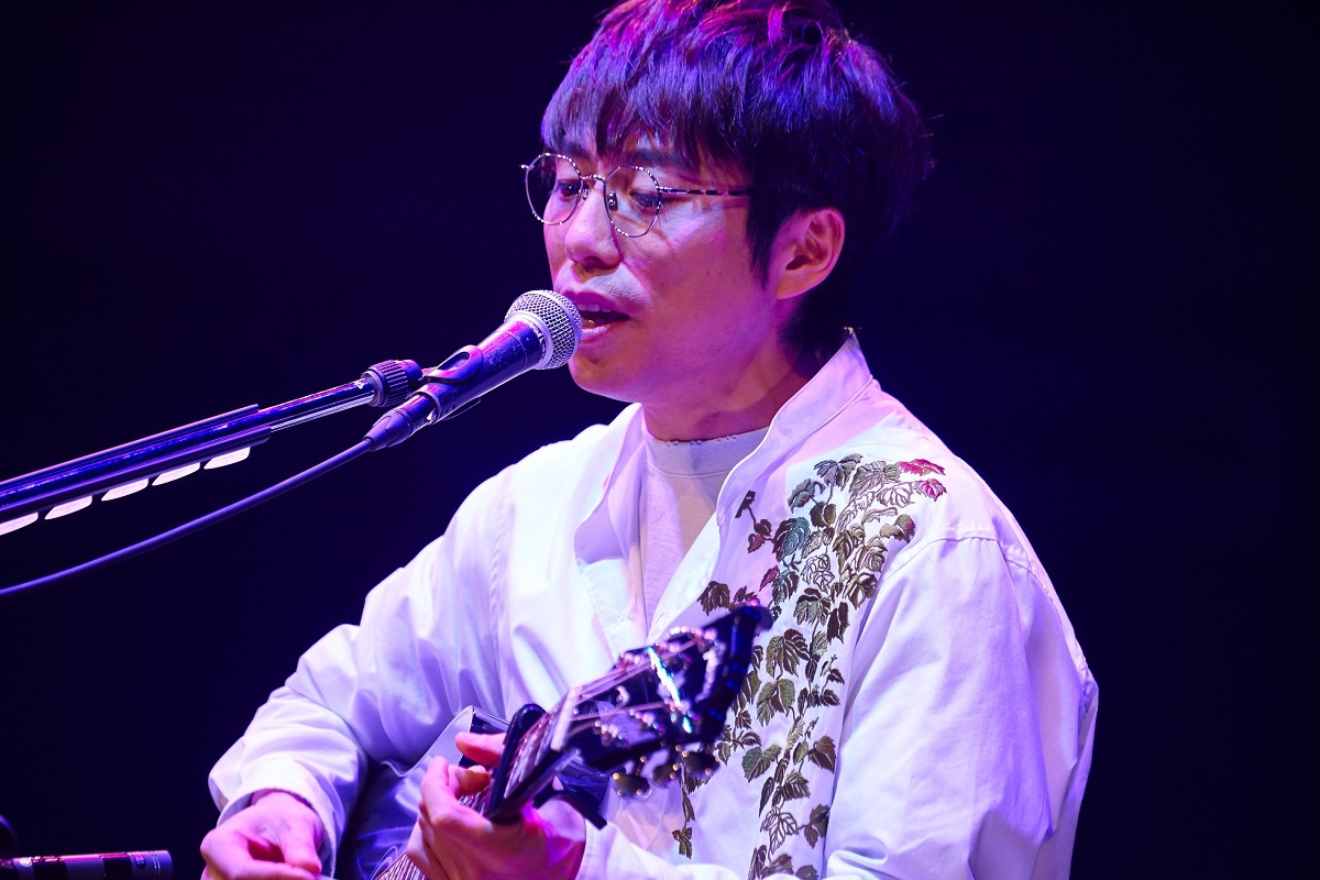 伸びやかなメロディと素直なコードで歌が入ってくる「靴紐」、綿々と続くフォークシンガーの人生や日常の機微を表現するDNAを継承したような、その名も「life song」。イントロや間奏でハーモニカを吹きながら弾き語る姿は原点でもあり、これからさらに年齢を重ねてどんな味わいを増すんだろう?という想像をさせてくれた。「ここは西を向いて歌おうと思います」と、ステージが転回し、披露した「花のように」では、出だしから歌が風に乗って届いているような伸びを聴かせる。黒橋と白橋の違いはテーマの違いでもあるが、白橋のこの日の選曲はシンプルなアレンジに映えるメロディアスな曲が多いことは間違いない。主人公が成長していくプロセスを感じる流れで、やさしいアルペジオに導かれて「産まれた理由」が歌われた。音源のスケール感も素晴らしいが、どこまでもシンプルな弾き語りで核心が届く。1曲の中で子どものような視点も、そろそろ親になる世代の視点もスムーズにつながるこの歌。生きるとは何か?という大きすぎるテーマから少し解放してくれる温かさを味わえた。