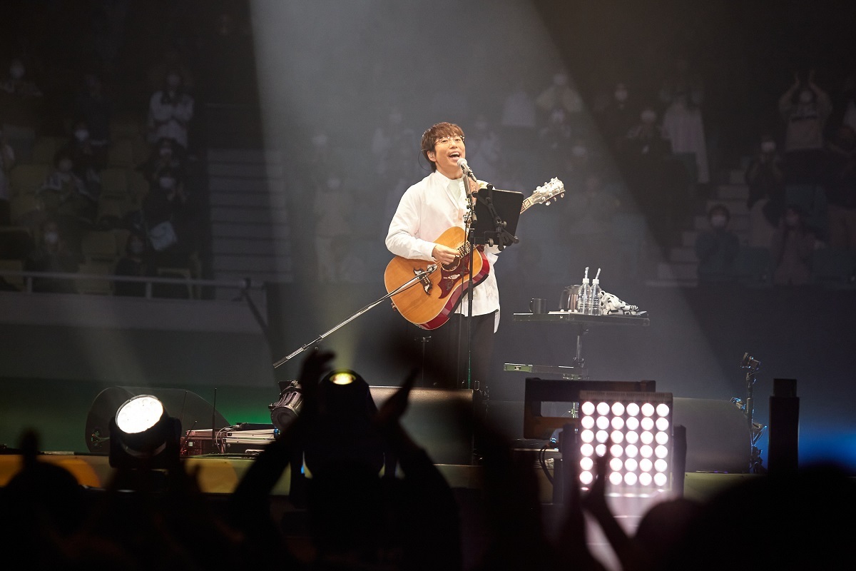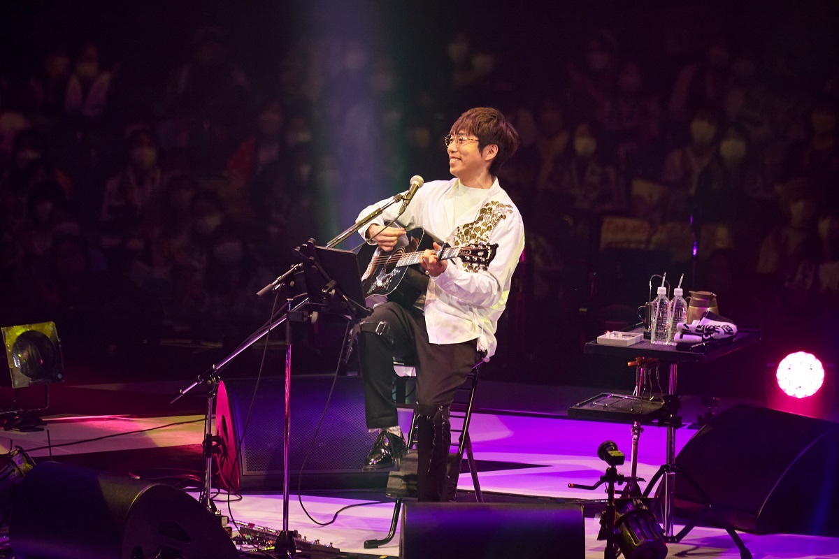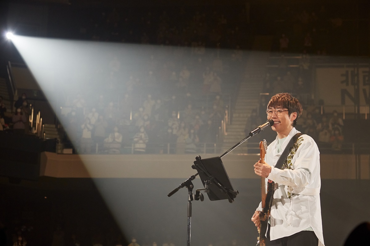 19曲を歌ってきた彼が感じたことは「歌ってて“会える”って大事なことだと思って。80まで歌えるとして、今38で、40何回しか会えないと思うと、こんな時期だからこそ、みんなに会えることが一番大きい」と、ライブというものの意義でもある感慨を伝えてくれた。そしてラストには「いろんな人に一番出会わせてくれた曲」として「福笑い」を披露。世界の共通言語は笑顔――このフレーズは永遠不滅だろう。笑顔でいられない日々が続くからこそ、心に持っていたい歌だ。会場の隅々まで照らすライトでマスク越しの笑顔がそこここに見える。この情景そのものが笑顔の伝染だった。