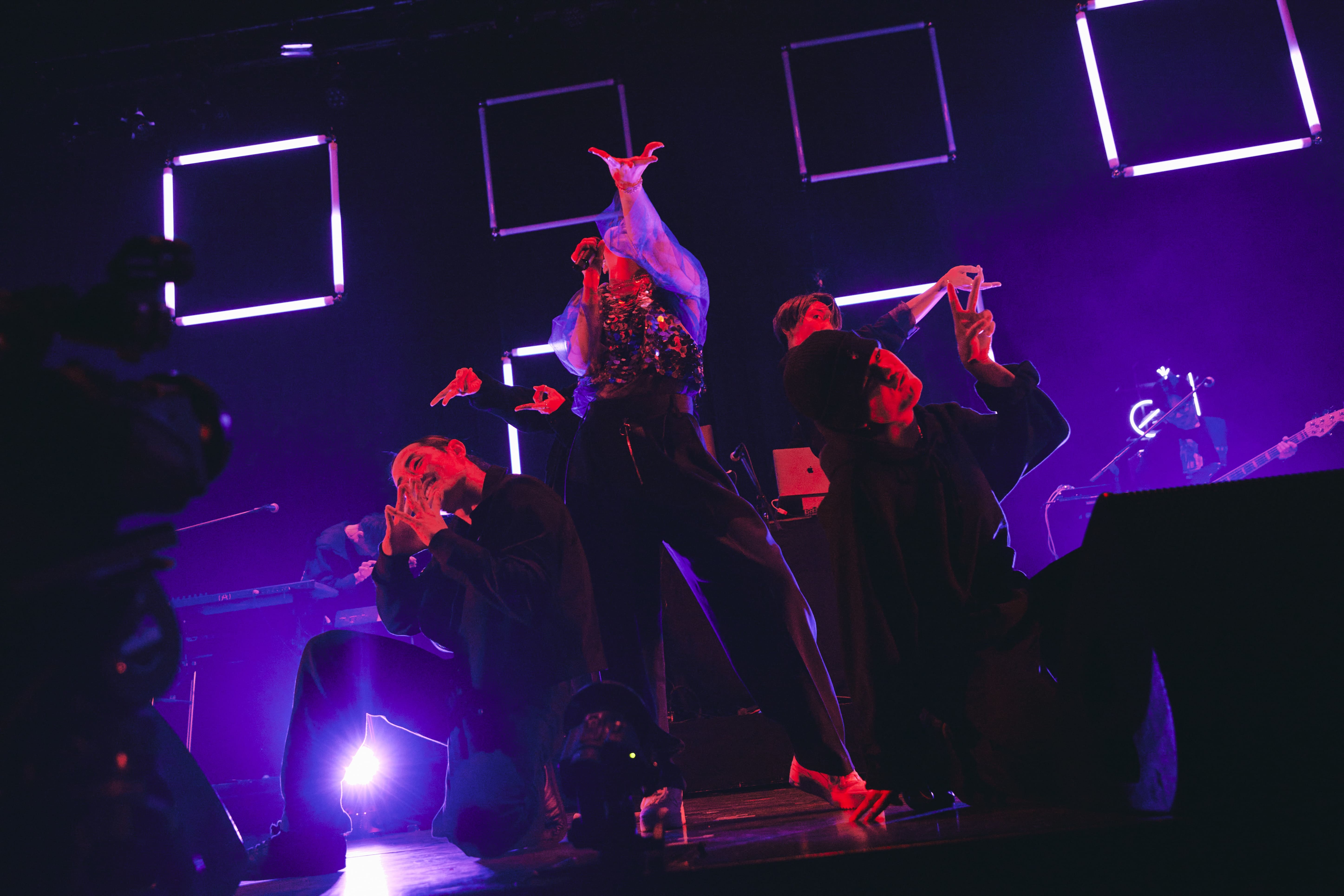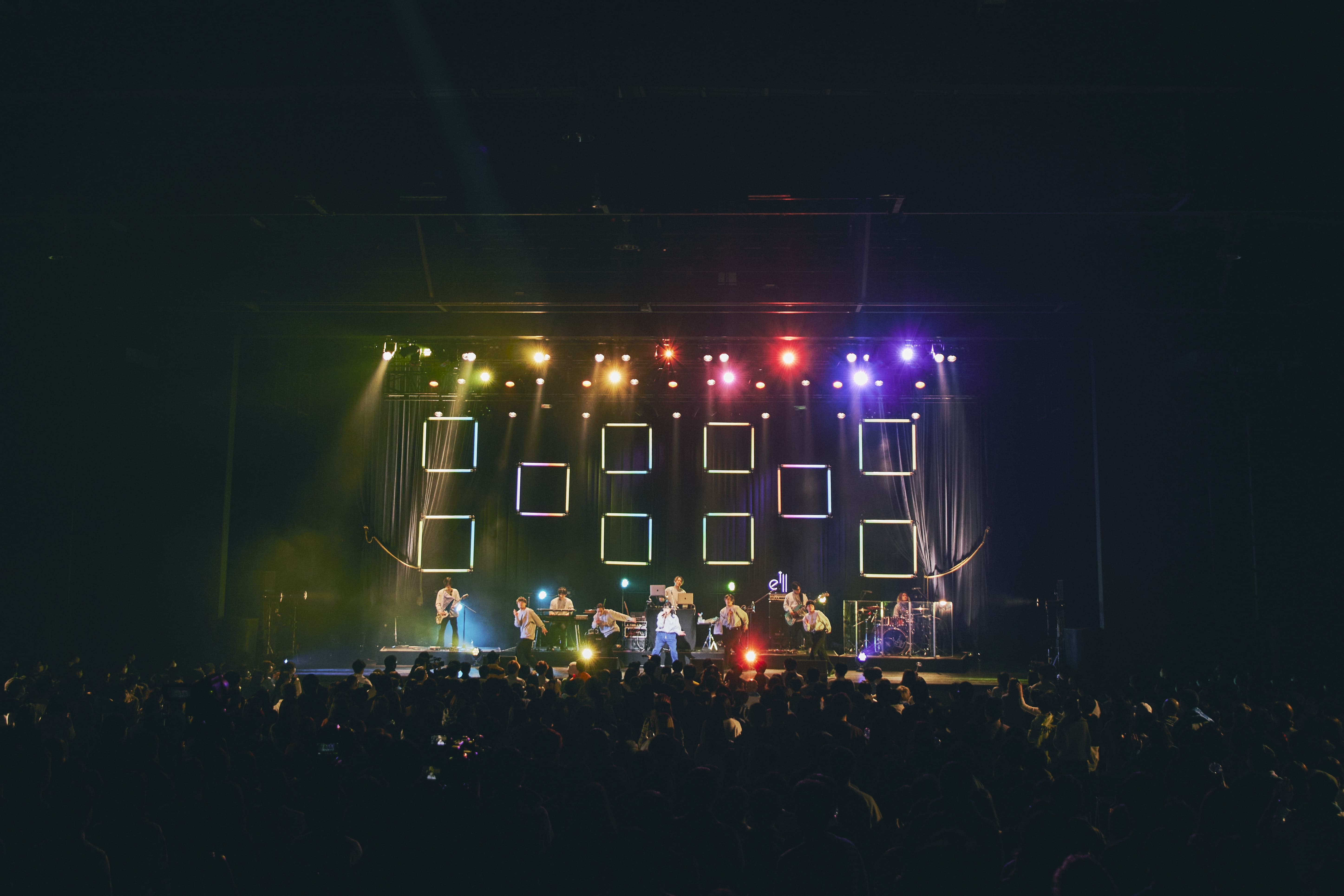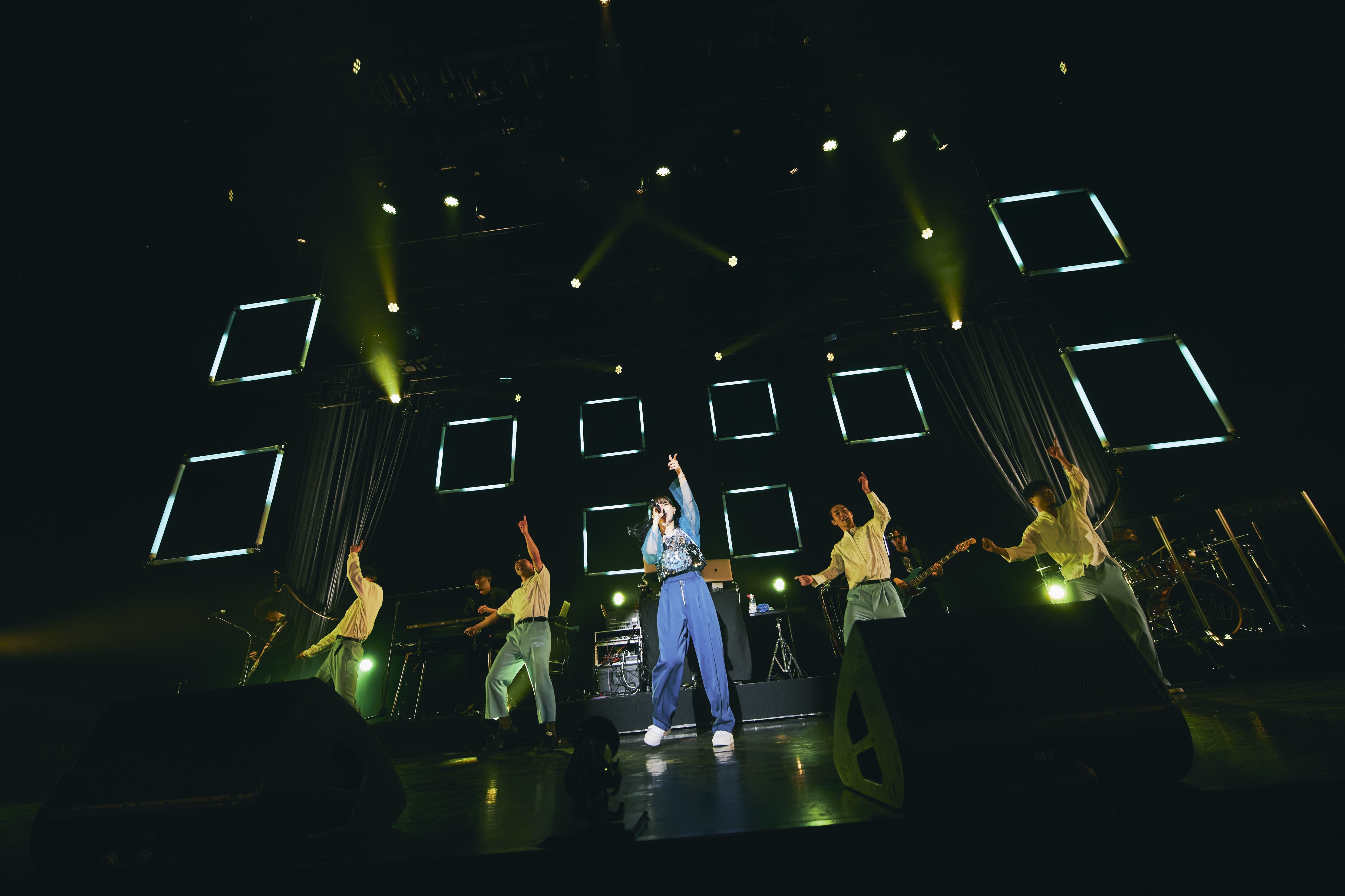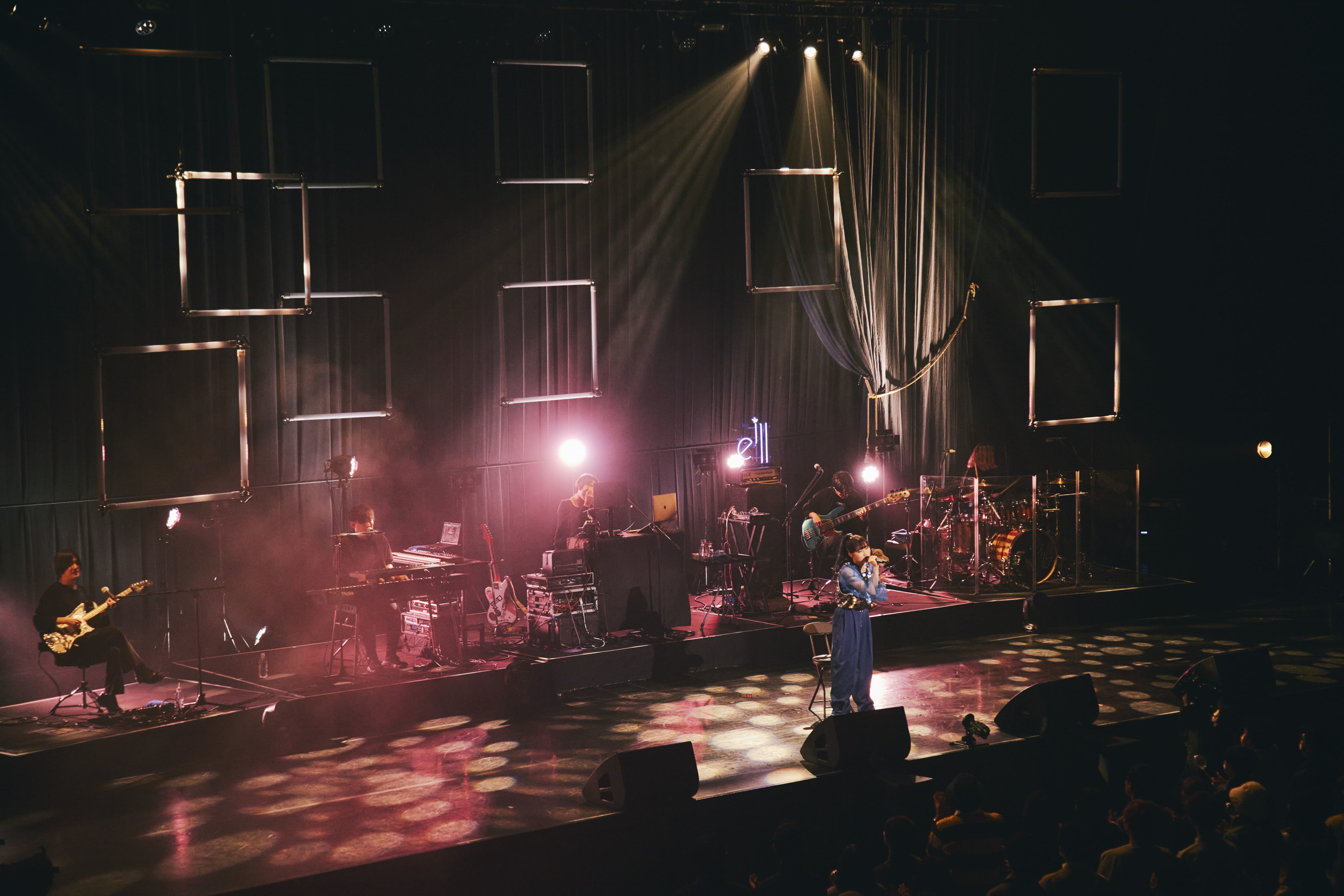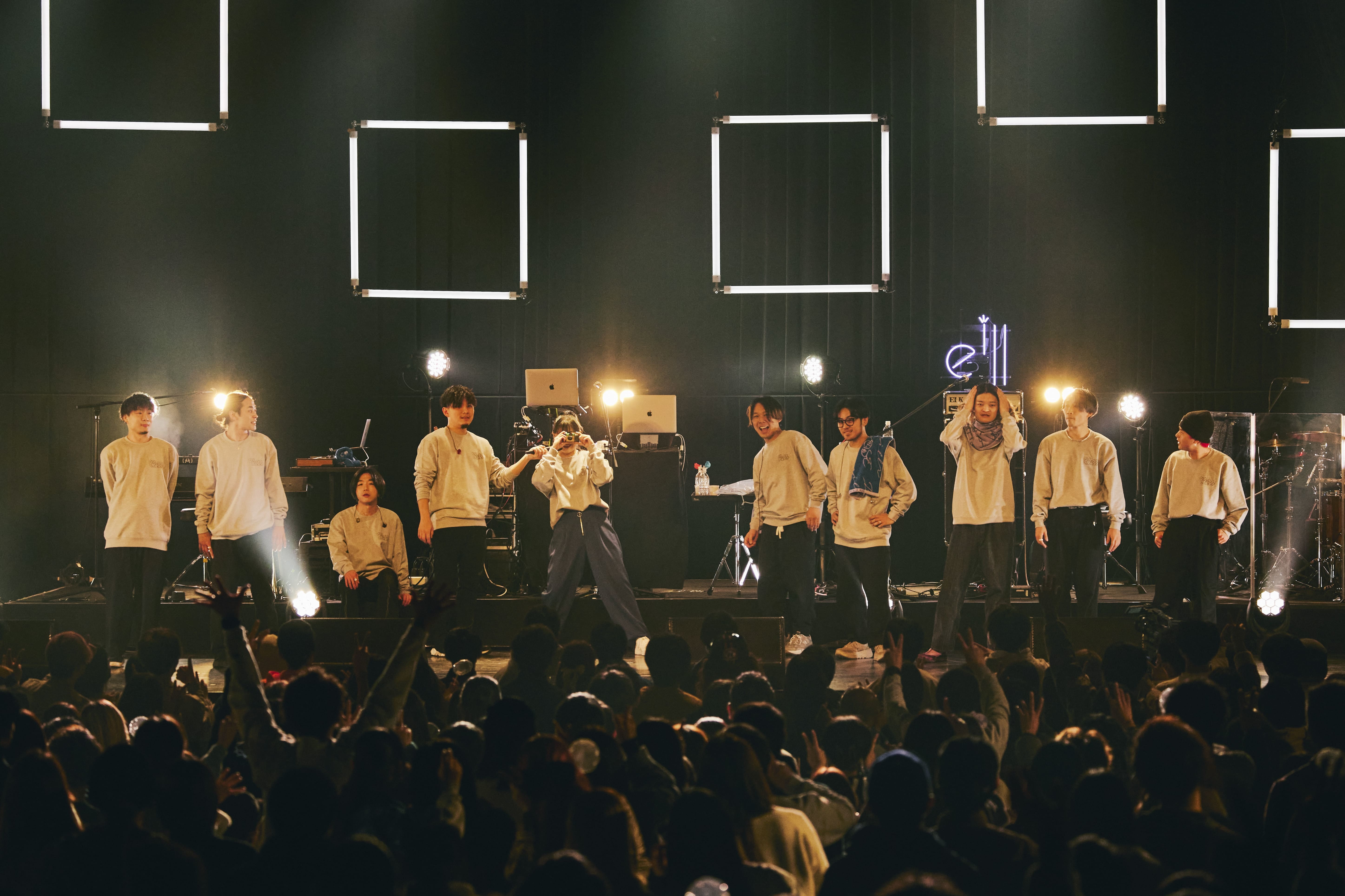 オープニングはニューアルバム『palette』から、明るくハッピーな一体感をまとうタイトル曲と、エレクトリックギターがうなりをあげるロッキンチューン「ここで息をして」。前回のツアーにも参加したダンスクルー・GANMIのメンバーがバックダンスに加わり、「FAKE LOVE」と2曲続けて華やかに盛り上げる。軽やかにエアリー、それでいてハスキーで太い存在感を持つeill独特のボイスは、ライブで聴くとさらにみずみずしい。ギター・サトウカツシロ、キーボード・宮田“レフティ”リョウをはじめ、アクの強い5人編成のバンドサウンドにまったく負けていない。