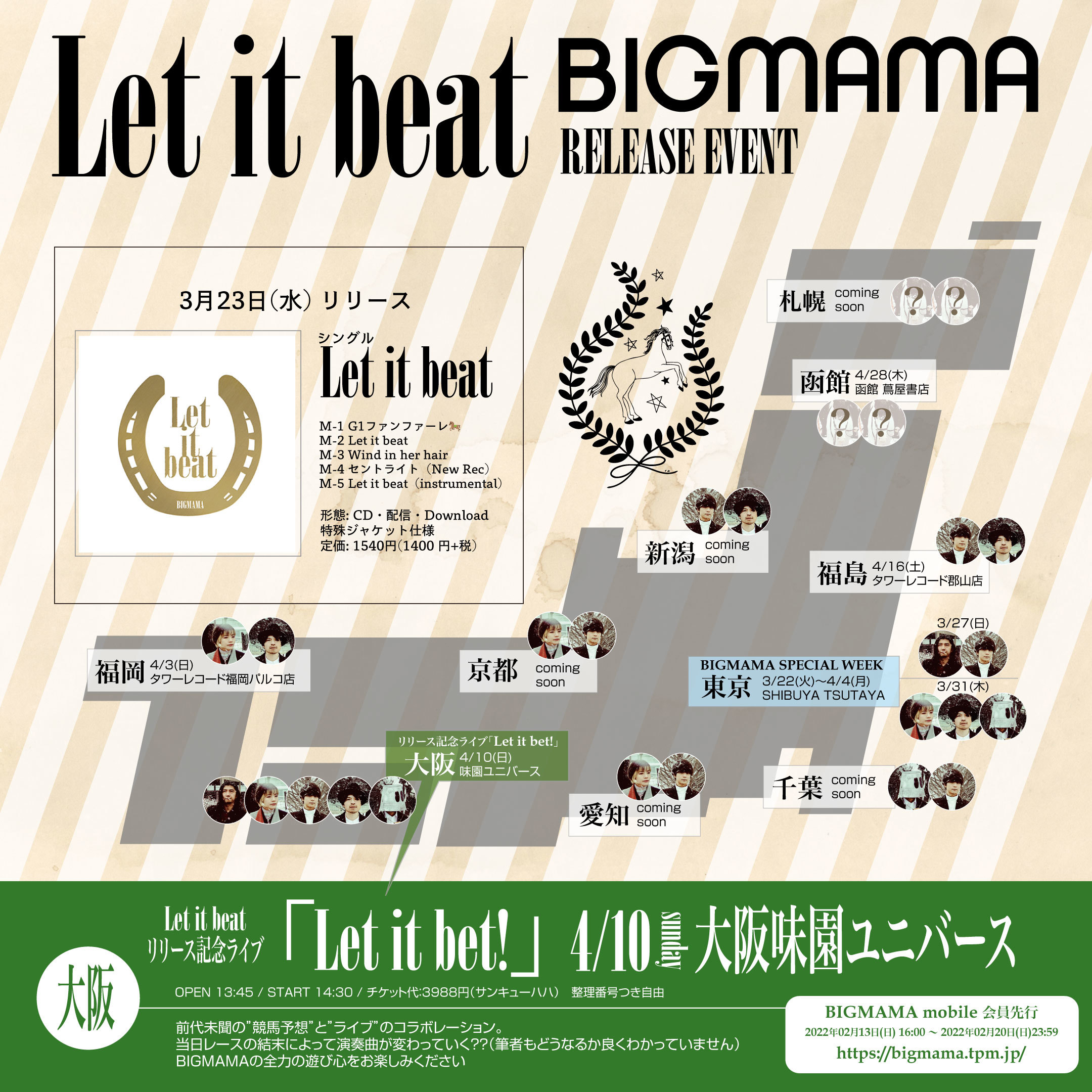 また、最新作「Let it beat」と関テレ『競馬BEAT』とのタイアップを記念し、中央競馬が開催される10都市でイベントを開催することも明らかに。ライブは、各地CDショップなど、場所ごとに様々なメンバーの組み合わせでのインストア・アウトストアライブとして実施予定だ。なお、大阪では、味園ユニバースにてリリース記念イベントが開催されることが決まっている。