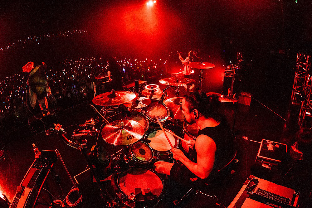 続く「HELL! or HELL?」はサンプラー、スクラッチ、フィルターなどを駆使したDJチュチュこと紡木のDJプレイからスタート。今回のライブではまるでリリックビデオのようにリアルタイムの映像に合わせてバックモニターに歌詞が表示されたり、各自の魅せ場に合わせたカメラワークや緻密なスイッチングなど、見る者を飽きさせない映像面での力の加え方を特に印象的に思った。どちらが良いとかの問題ではなく、バックモニターにバンドのロゴだけを背負って、身体1つでステージを縦横無尽に暴れ回ったFaLiLVとは対照的な演出ではあるが、実際に両者ともに視覚的にも楽しめたという点に関しては異論ないだろう。