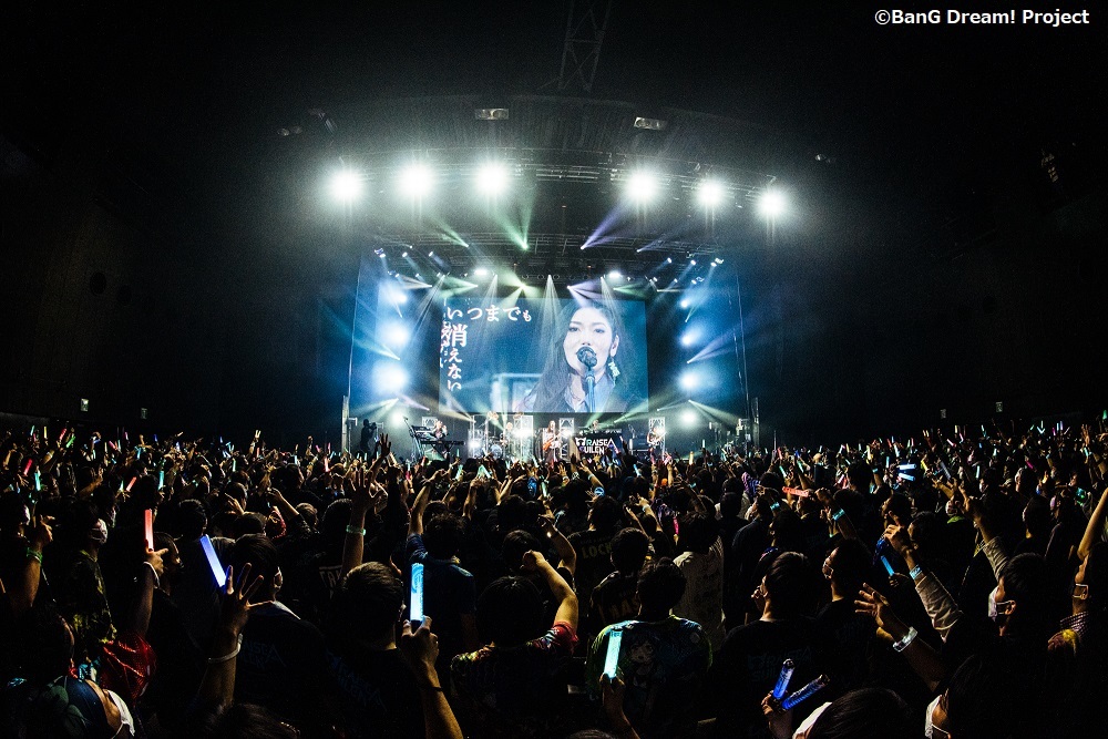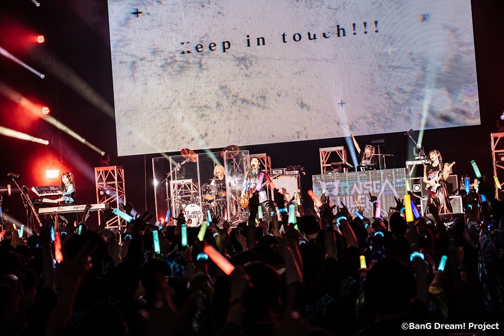 インターリュードを挟んで続いた7曲目「CORUSCATE -DNA-」もライブ初披露というだけでなく、ガルパのバンドストーリー2章に合わせて書き下ろされた、言わばRASの勝負曲という事もあり、フロアの熱気は最高潮へ。