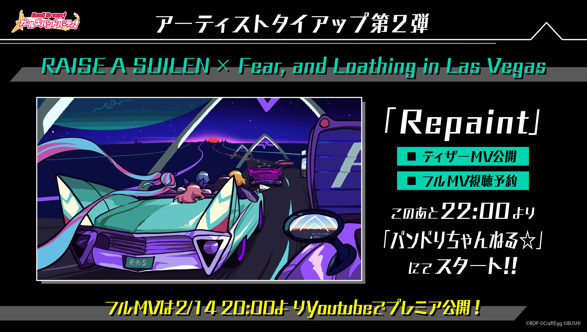 「それじゃ早速聞いてください!」と6曲目は「Repaint」。カートゥーンチックなアニメーションMVも合わせて初披露された。RASらしい印象の歌詞・映像にに仕上がりつつも、またベガス節の効いた転調もあり、最後まで油断できない1曲となっていた。2/14の20時よりフルverのMVがYoutube上でプレミア公開予定とのことなので、ぜひそちらの更新を楽しみにして頂きたい。
