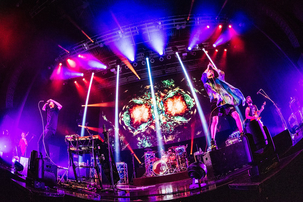「手を叩け!」と客席を煽り、Minamiはショルキーに持ち替えての演奏など、FaLiLVのライブは本当に視覚的にも目まぐるしい。エスニックなテイストも織り込まれた「Keep the Heat and Fire Youself Up」ではSoとMinamiが某銀河系最強の戦闘民族でいうところの”フュージョン”的なお決まりのポーズから演奏がスタートし、軽快なダンスビートでフロアの横ノリを誘い、これまたFaLiLVの特徴でもある大胆な転調で激しいヘドバン、エモーショナルな一瞬の静寂のブレイクなど、聴覚的にも目まぐるしくステージが展開されていく。続く「LLLD」はミクスチャーロックのテイストもあり、音楽性の幅広さも感じさせる。