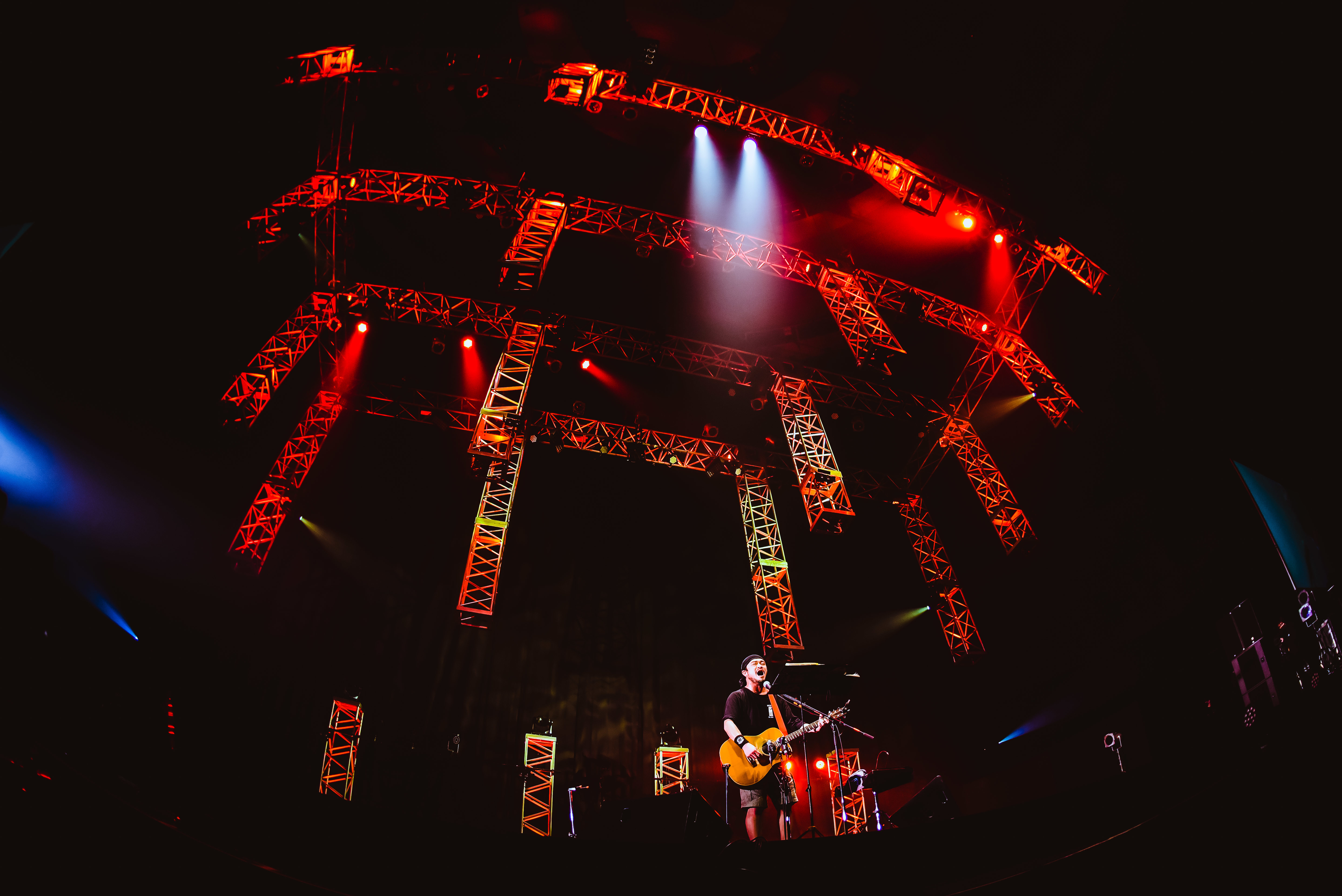 「精一杯歌いますので、のんびりとお付き合いください」と照れくさそうにあいさつし、まずは「おーい! おーい!!」から幕を開けた竹原ピストル。口笛が導く「It’s My Life」の中、ふと客席に目を向けると、ステージへくぎ付けになるオーディエンスの姿が印象的で、「LIVE IN 和歌山」では、まるで歌詞中のキャラクターが眼前に現れたかと思うほどの表現力と温かな視線を示しながら、曲ごとにどデカいクライマックスを生み出していく。語りにも似た実直な歌唱での「初詣」で感じるのは、これぞ言葉の力。心臓ごとわしづかみにされていくような生々しさは、ライブだからこその音楽体験だ。「みんなー、やってるか!」では、祭り囃子のごとく高密度の手拍子が湧出! シンプルなライティングとギター、そして竹原ピストルの歌。ただそれだけで、この広々としたアリーナをやすやすと我がものにしていく。