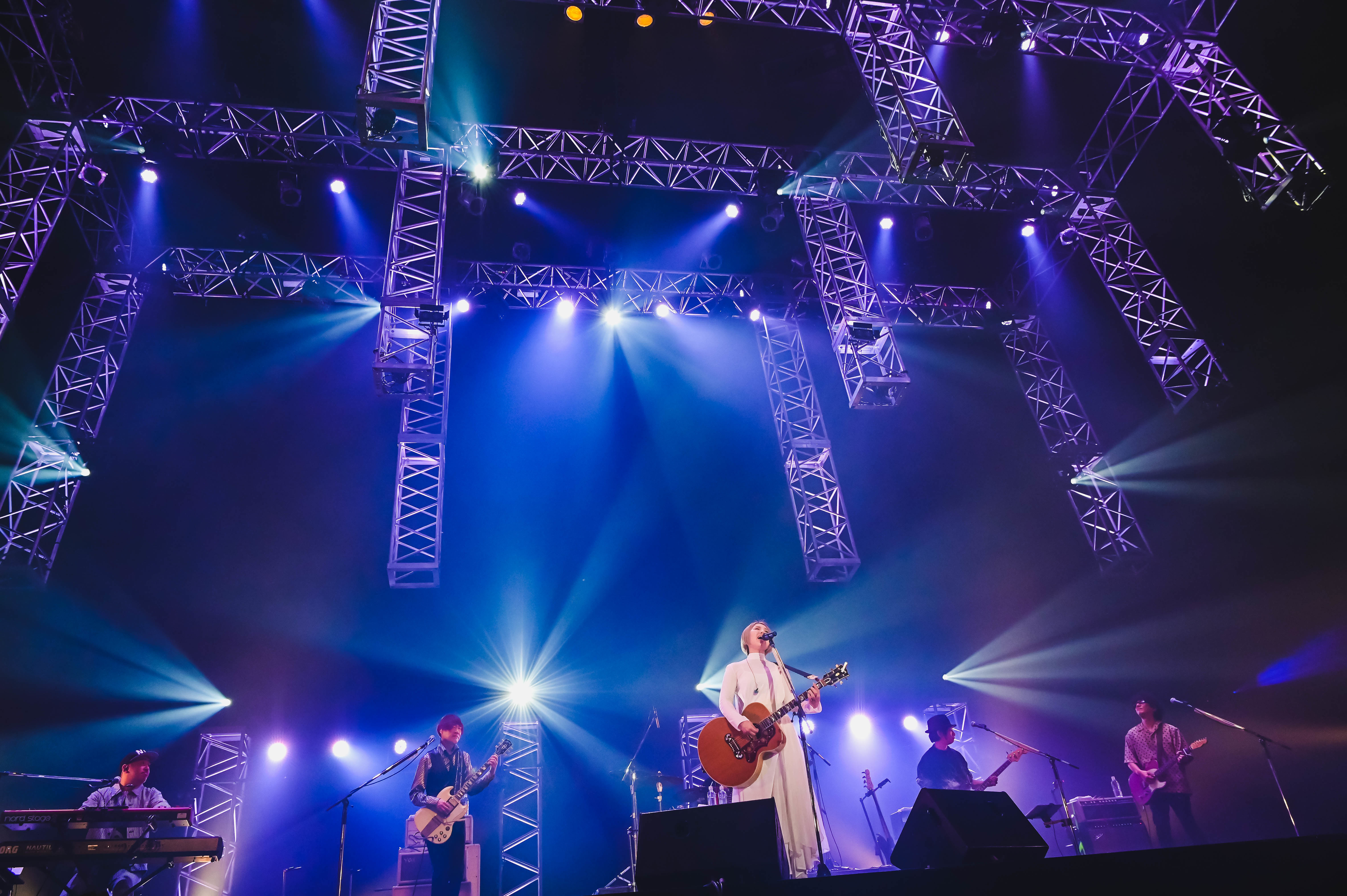 まずはMCを務めるFM802のDJ・中島ヒロトからの熱いオープニングコールを受け、初っぱなの「Believe in yourself」から、鮮烈な歌声を聞かせてくれた阿部真央がオンステージ! 真っ白なワンピースに身を包み、大観衆を見る見るうちにモノにしていく手腕はさすがの一言だ。5人のバンドメンバーと共にエモーションたっぷりにギターをかき鳴らし、続く「モンロー」ではハンドマイクで、視線を客席に合わせるべく低空姿勢を取りながら、コケティッシュな魅力全開に観客をトリコに。西川進(Gt)が電飾付きのド派手なギターで弾き倒したかと思えば、一転してエッジィな「お前が求める私なんか全部壊してやる」を投下! 声色一つとっても極彩色の表現で魅せるなど、改めてショーマンシップの高さを感じさせる。「(歌詞を)間違えた!」なんてご愛嬌を挟みつつ、再びアコギを手にした「まだいけます」は、厚みあるトリプルギターと彼女のハイトーンボイスが実に圧巻だった。