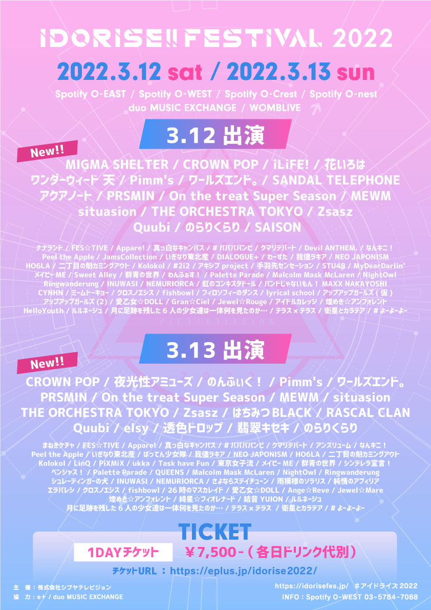 IDORISE!! FESTIVALは2019年にスタートしたシブヤテレビジョンが主催するサーキットイベントで、今回は2DAYS、6会場連動のサーキットイベントでの開催を予定している。この度、第8弾出演アーティストとして、MIGMA SHELTER、CROWN POP、夜光性アミューズ、iLiFE!、のんふぃく!、花いろは、ワンダーウィード 天、Pimm’s、ワールズエンド。、SANDAL TELEPHONE、アクアノート、PRSMIN、On the treat Super Season、MEWM、situasion、THE ORCHESTRA TOKYO、Zsasz、はちみつBLACK、RASCAL CLAN、Quubi、elsy、透色ドロップ、翡翠キセキ、のらりくらり、SAISONの25組が発表された。出演者は今後も随時追加される。