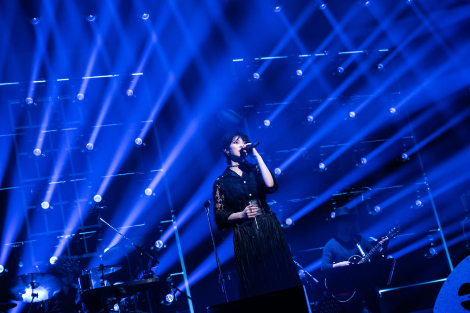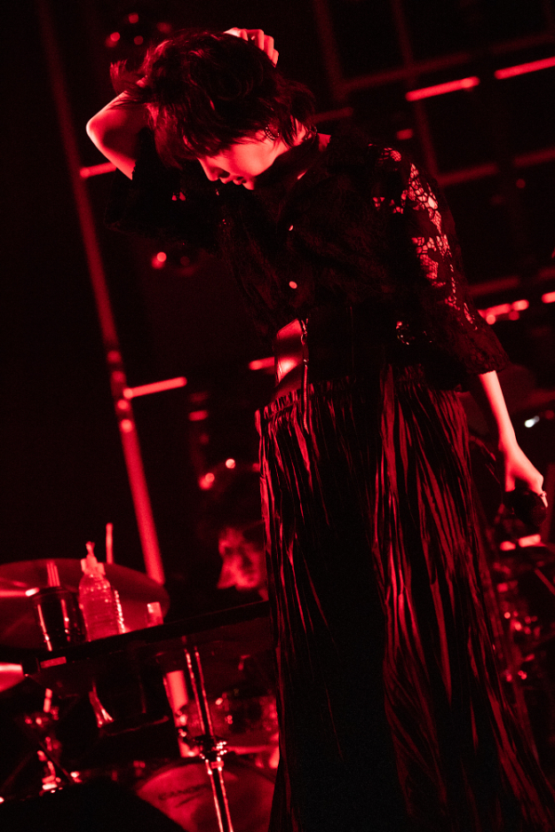 その後、真っ赤なシースルートップスにタイトなパンツスタイルから上下黒のロングスカートにスタイルチェンジした家入は「Silly」「もし君を許せたら」「未完成」など計5曲を情感たっぷりに歌い上げた。そして、「これからも変わらない気持ちを持ち続けてこのステージに立っていきたい。むしろこれからが本番なんじゃないかなって。この10周年のタイミングで、20周年を目指したい、やっぱり私には音楽なんだ!と思えたことはとても嬉しいです。改めて、目指すところにいくためには近道や魔法などはないんだなと思って、地道に毎日を生きよう、今この時を生きようと思いながら、約6年ぶりに西尾芳彦さんとタッグを組んで生まれた曲をここで届けます」と話し、「Borderless」を力強く披露した。