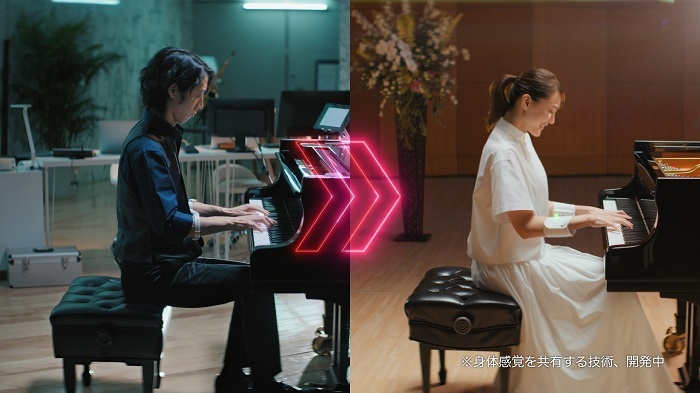 綾瀬がピアノを弾くことができていたのは、遠くにいる角野の手の動きを電気信号に変えて転送し、他者と共有できるドコモが開発中の「人間拡張」の技術を活用したため。角野の動きとシンクロすることでピアノを演奏する少し先の未来の姿だ。