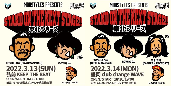 3月13日(日)は弘前 KEEP THE BEATで行われ、TOSHI-LOW(BRAHMAN/OAU)とLOW IQ 01の盟友二組が出演。3月14日(月)は盛岡 club change WAVEで行われ、TOSHI-LOW(BRAHMAN/OAU)とLOW IQ 01に加えて茂木洋晃(G-FREAK FACTORY)の三組が出演する。さらに両日共に、MCとして田原”104”洋が参加。