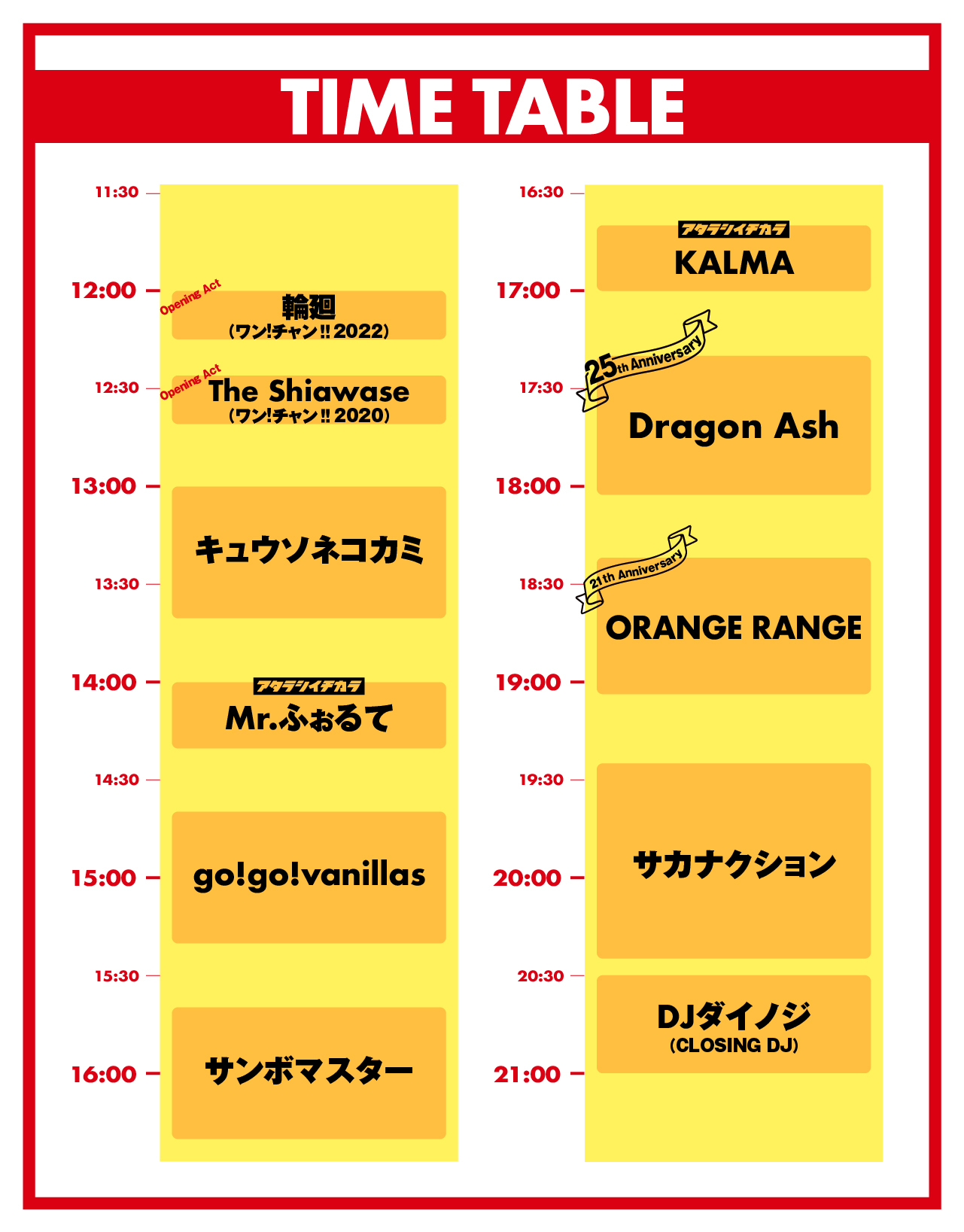公開されたタイムテーブルでは、トップバッターにキュウソネコカミでスタートし、トリは3月30日にコンセプトアルバム『アダプト』をリリースするサカナクションが務める。