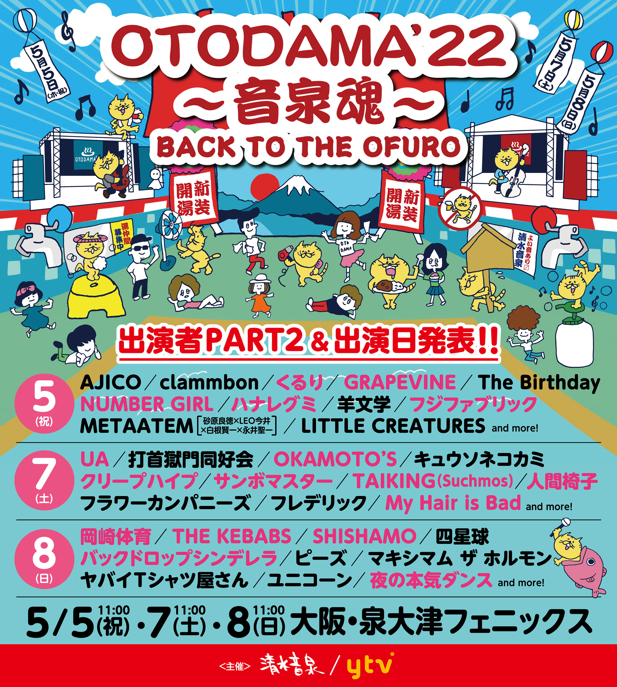 5月5日(祝)、7日(土)、8日(日)の3日間、大阪・泉大津フェニックスにて開催される『OTODAMA’22〜音泉魂〜”BACK TO THE OFURO”』の追加出演者と日割りが発表された。