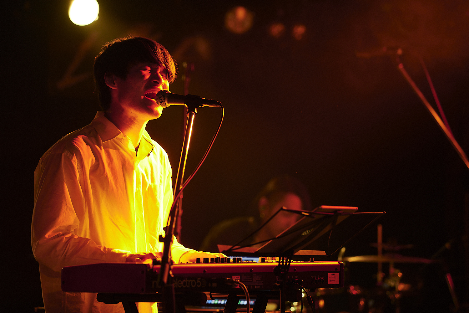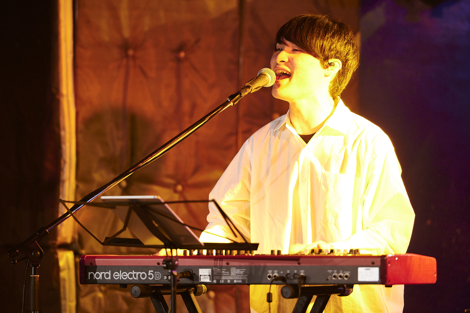 ぜったくんからのバトンを受け取り、いよいよ米澤のステージに。この日はべース・藤本僚太郎、ドラム・久保佑太、そしてキーボードは米澤のトリオ編成だ。1曲目は「コップ」。迫力のある低音が生み出す心地よいまどろみ感の中で、柔らかな歌声を届けていく。続く「CASE」では、バンドメンバーと顔を合わせながらグルーヴィーにフロアを揺らすと、立て続けに「春風は君のもの」へ。爽やかさはありながらも、どこか少しだけ感傷を帯びた旋律と、軽快でダンサブルなビートを全身で受け止めると、淡い春の景色が目の前に立ち上がってくるだけでなく、その匂いや温度までをも感じられるよう。米澤は鍵盤を奏でながらも、ときにマイクを握り、客席へ向けてじっくりと歌を届けていく。