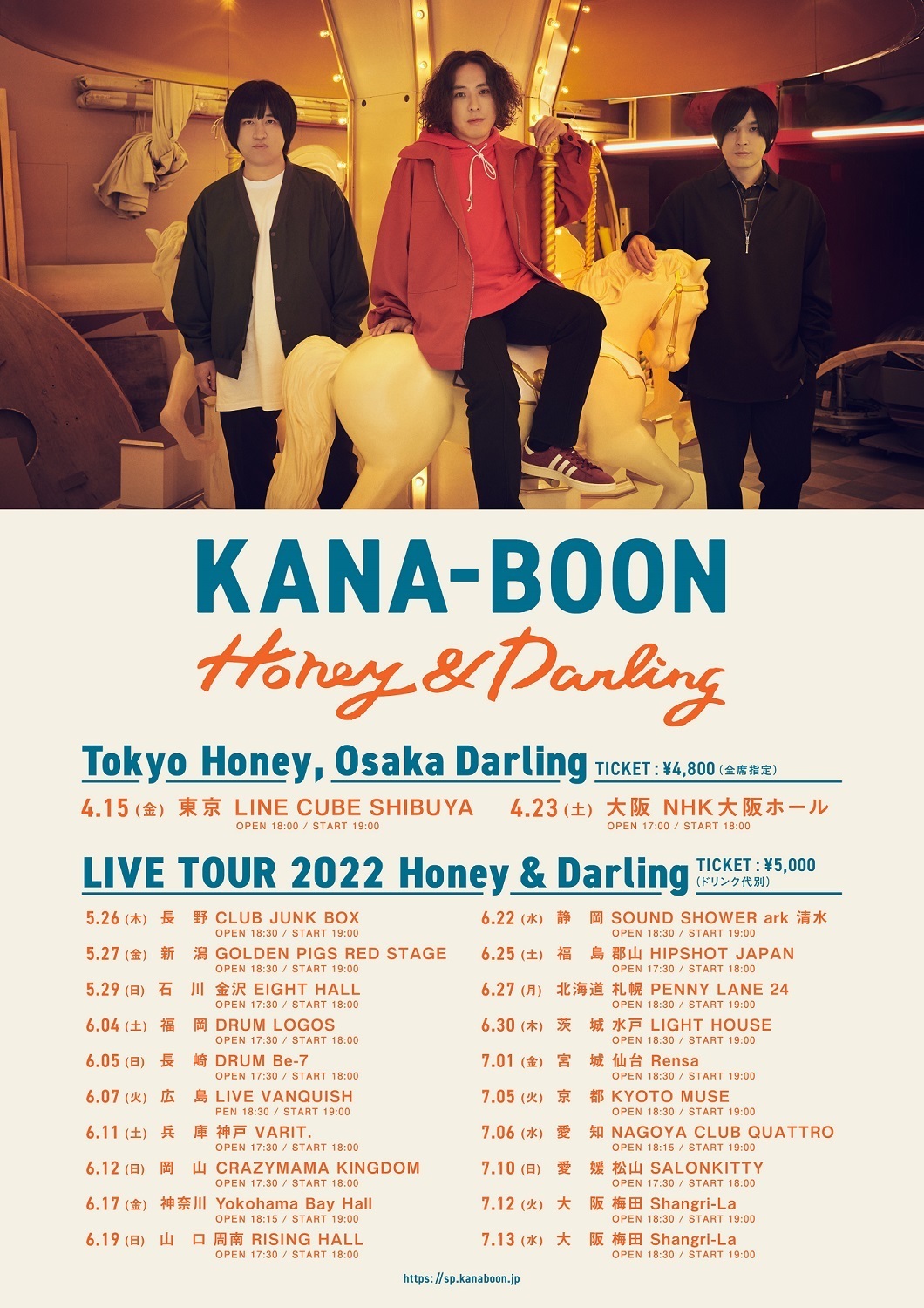 このツアーは、3月30日にリリースとなるニューアルバム『Honey & Darling』を引っ提げ、4月に東京・大阪で開催されるホールワンマンライブ『KANA-BOON presents「Honey & Darling」-Tokyo Honey, Osaka Darling-』に続いて、全国19都市にて全20公演行われる。
