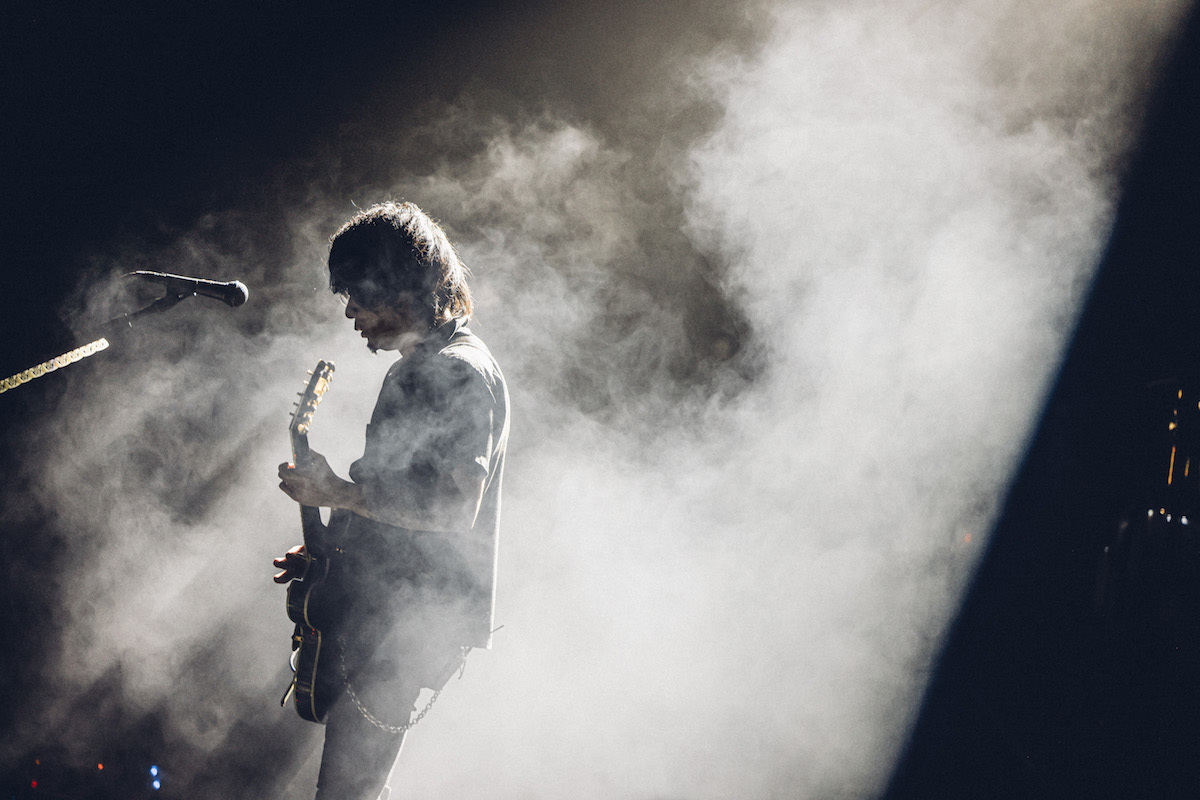 暗闇を切り裂くスポットライト、生形真一の鋭いリフ一閃、1曲目「Deeper,Deeper」が始まった瞬間に空気が変わる。ロックバンドのライブとダンスミュージックのパーティーを足して2で割らないような、強力な音圧と爆風がステージから吹きつける。「Bloom in the Rain」から「Spirit Inspiration」へ、大喜多崇規と日向秀和の叩き出すリズムは、精密なドラムンベースやトリッキーな変拍子などテクニカルな側面と、サビでは痛快メロディックに突き抜ける豪快な側面と、コントラストがとても鮮やか。村松が「オニィ!」と叫んでドラムソロ、そしてギターソロへと、それぞれスポットを浴びる「白昼」の大時代な仕掛けがむしろ新しく見える。バンドの中にロックの歴史が畳み込まれて見える。