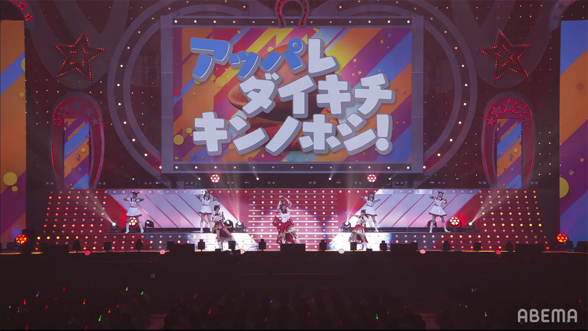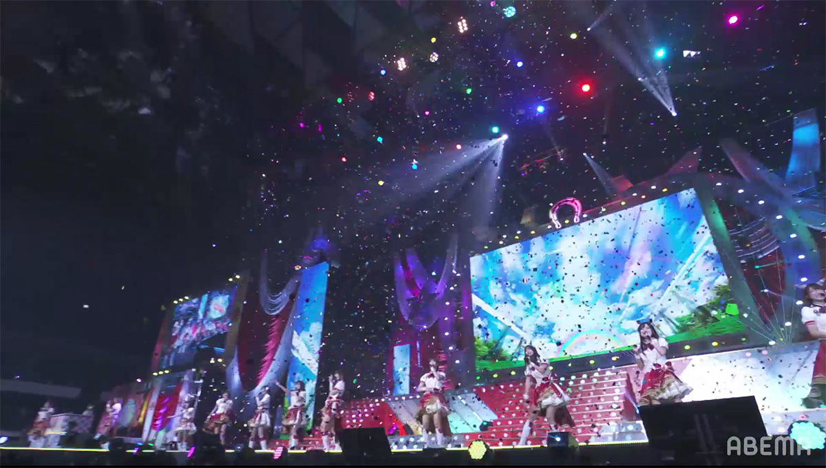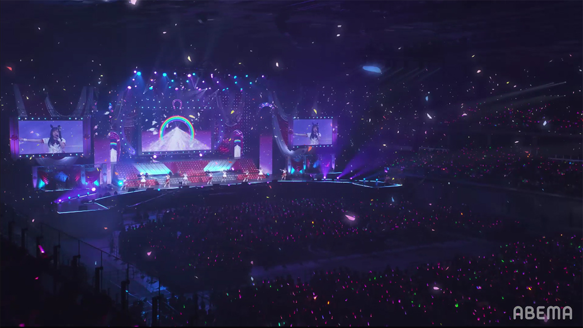ゲーム内のティアラ路線を勝ち抜いたウマ娘が唄えるナンバーということで、そちらで活躍するウマ娘を演じるメンバーにハッピーミークを加えた5人が勢ぞろい。咲き誇る桜をイメージした曲を可愛く元気に、そして途中から激しいロックへと転調するパートでは力強く腕を振り上げて会場のファンと一体になって5人も盛り上がる。そして配信版のクライマックスでは場内に桜吹雪が舞い、客席もコンサートライトの桜色で染まるという華やかな盛り上がりを見せた。