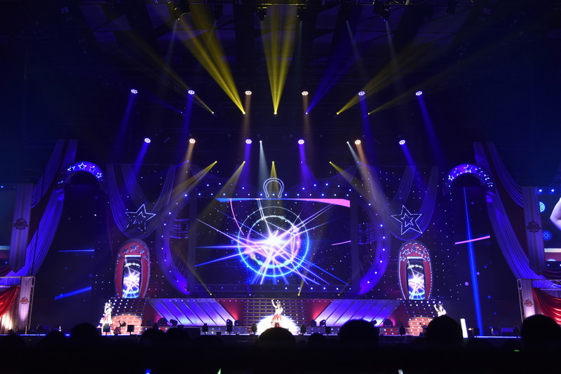 そして軽快なファンファーレ共に8名のウマ娘ダンサーが登場。光り輝く星やウマ娘達のシルエットが映し出されるスクリーンをバックに、見事なダンスでプロローグを盛り上げていく。そしてステージに各ウマ娘のポーズを決めた出演陣がせり上がりながら登場。いよいよライブのスタートだ。