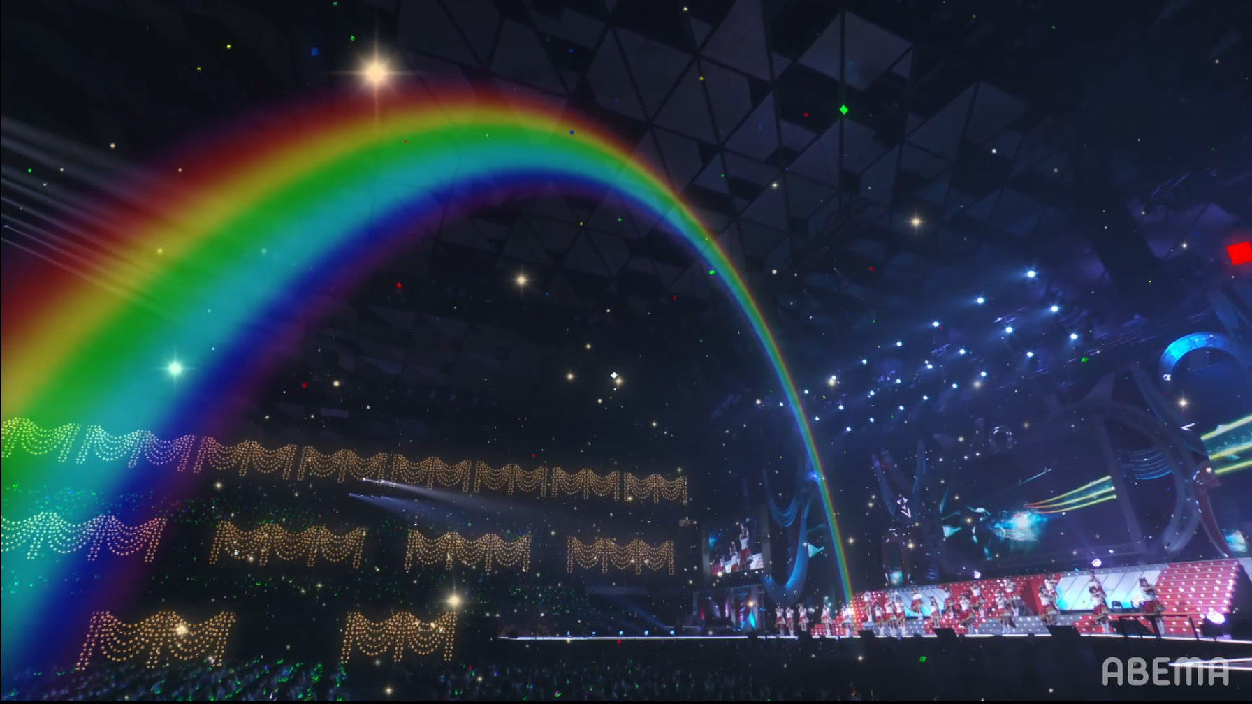 ステージ上には出演陣全員が登場し、いよいよライブもラストナンバーに。大好きなモノを集めて未来へと向かっていこうというメッセージを高らかに唄い上げたこの曲に込められたのは、そんな宝物をウマ娘達に与えてくれたのが応援してくれたファンのみんなだという感謝の気持ち。 一緒に夢を追いかけてくれてありがとうというスペシャルウィーク役・和氣あず未からのメッセージも織り込まれ、そんな想いを共に曲はクライマックスに向けて壮大にテンポアップしていき、配信版では会場内に大きな虹がかかる演出も。そしてラストに近づくと、スクリーンを埋めつくしていた宝物の数々が宝箱に収まっていき、それが閉じるのと同時にステージも静かな闇の帳に包まれていった…。