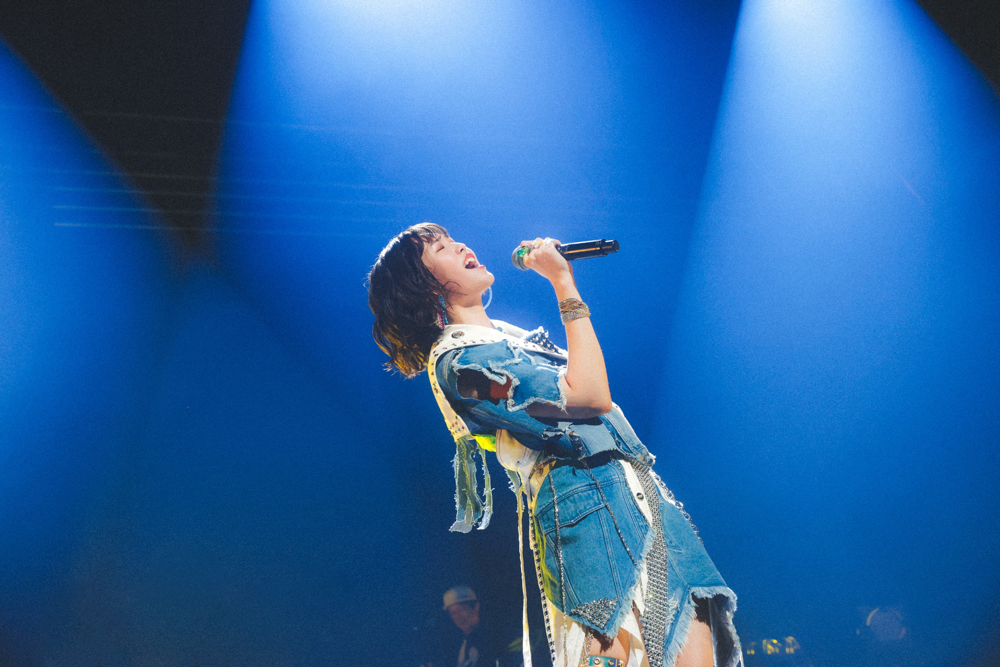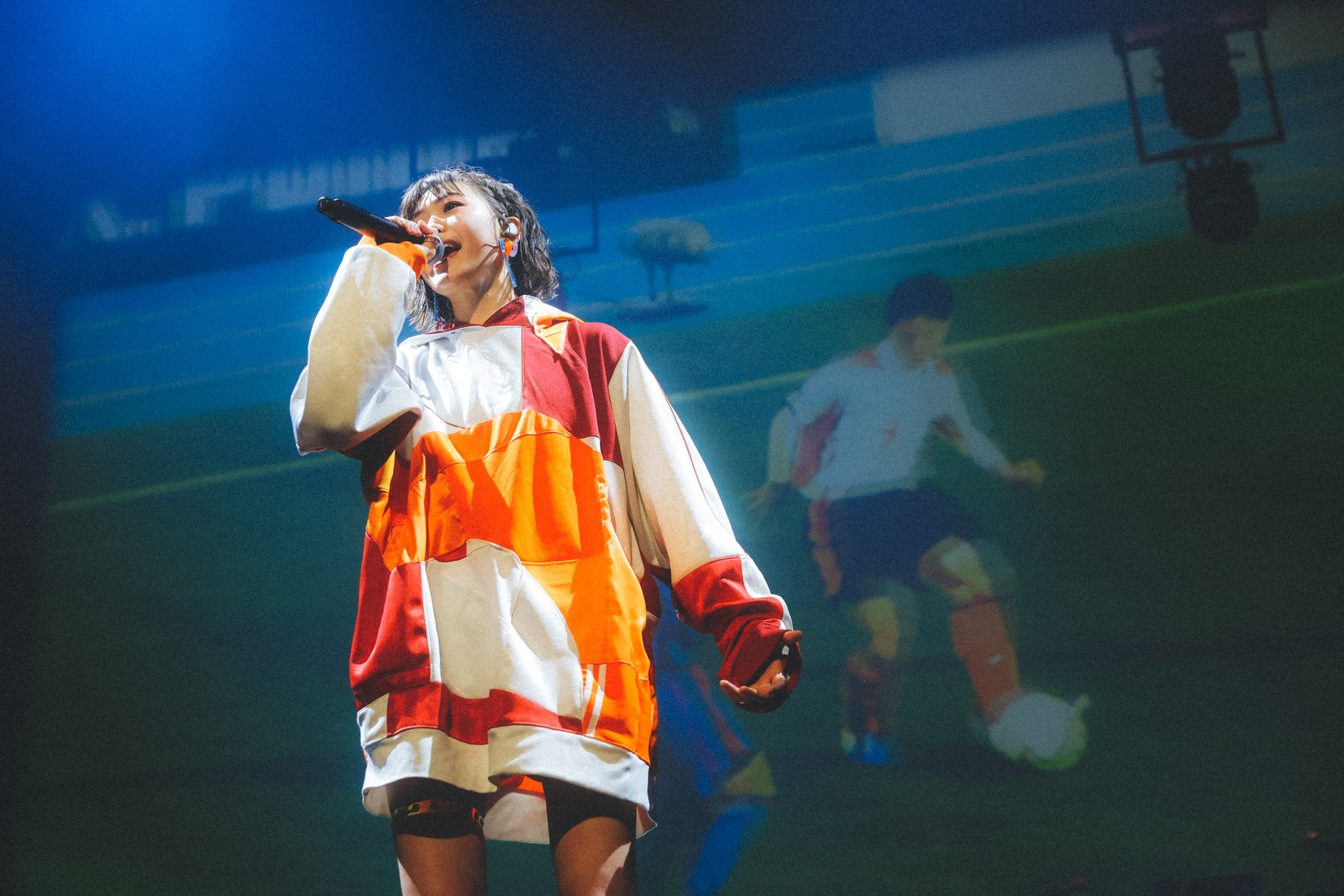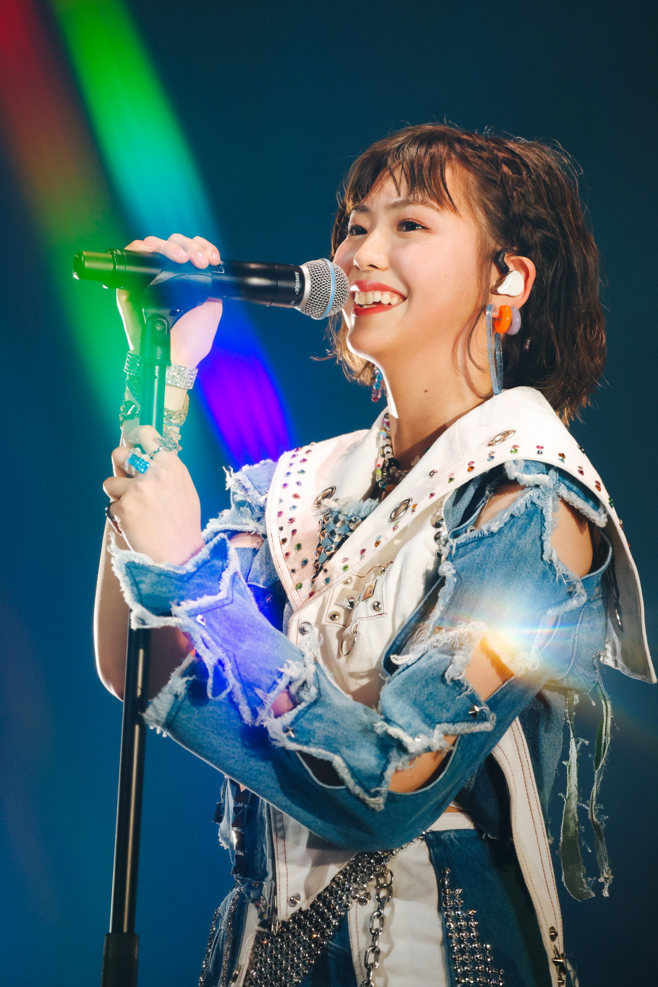一転、「タオルの準備いいですか? ない人はクラップ!」と呼びかけた「ヒラヒラ」では、自らタオルをぐるんぐるん振り回したり、クラップしたり、ステージ左右のお立ち台に乗ってオーディエンスに手を振ったり。軽やかにターンするたびに揺れる、デニムジャケットにあしらわれた真っ白なセーラーカラーやキラキラの装飾が眩しい。ダンサーが加わった高揚感たっぷりなEDMナンバー「StaRting PoiNt」ではダンスも披露して、耳も目も奪われっぱなしだ。