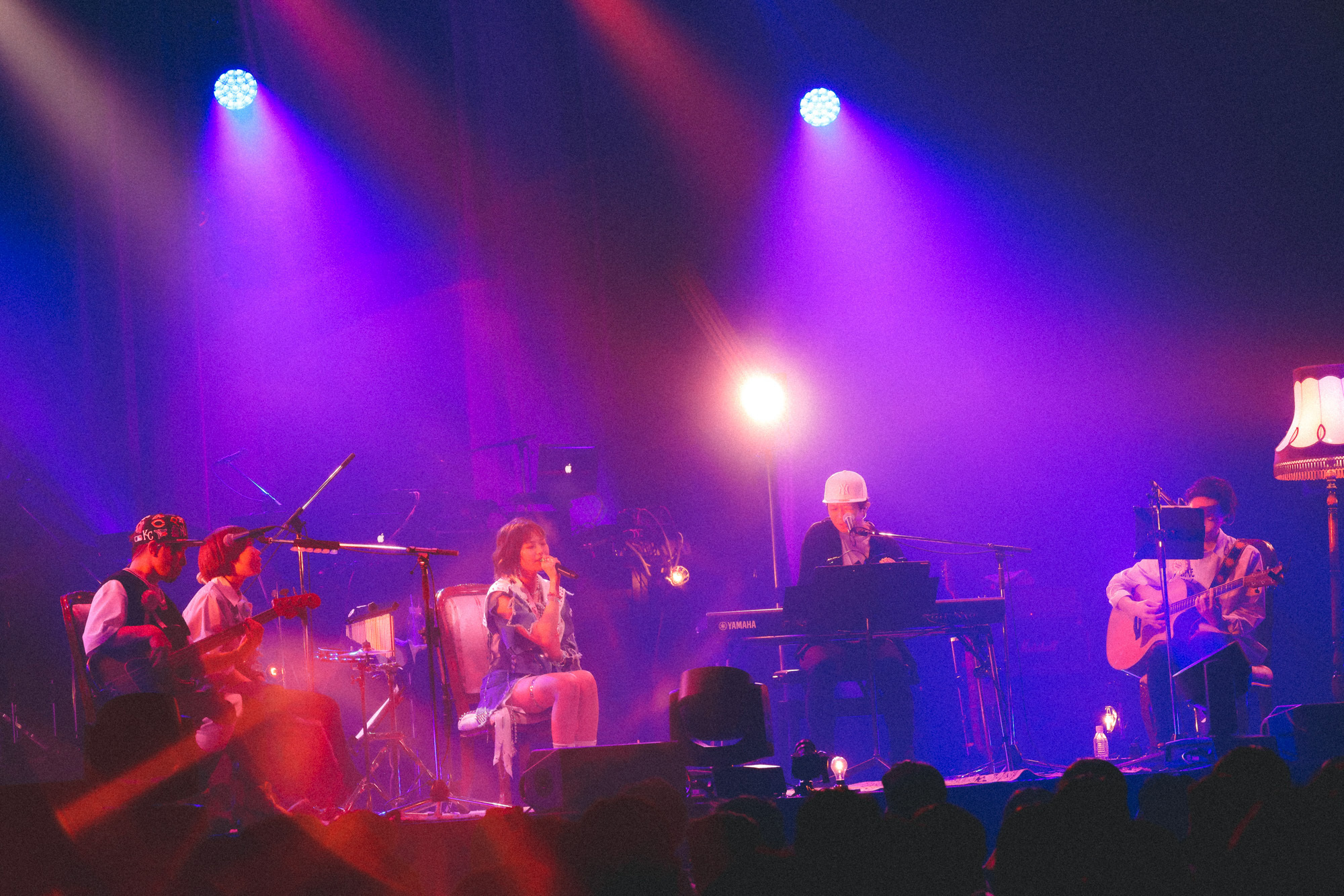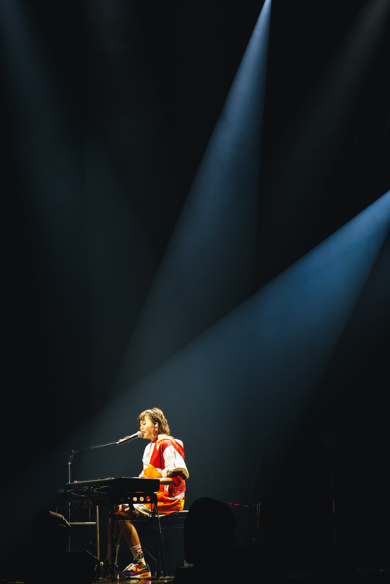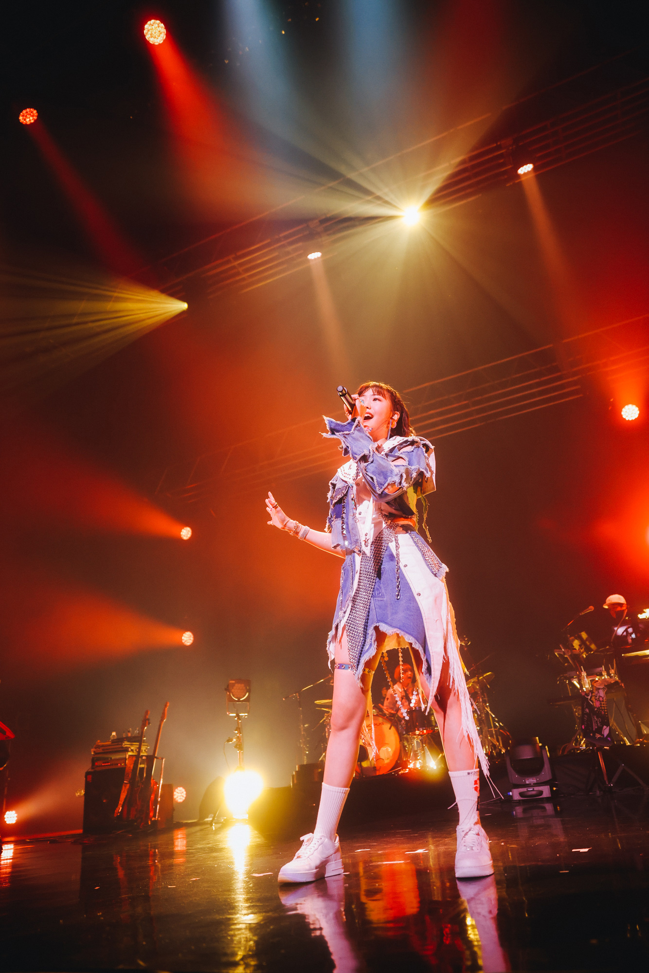 学生生活がうかがえる制服姿のオープニング映像があけると、アシンメトリーデザインのデニムジャケットを着こなして、颯爽とステージに現われた三阪。「最高の夜にしましょう!」と笑顔を見せた1曲目は、これまでのライブでラストに持ってくることが多かった「今だけは好きなものを好きでいたい」だ。伸びやかな歌声は、生バンドの演奏にとても映える。サビ前の「いくよ!」というかけ声にも、<君>でフロアを指さす姿にも高まってしまう。