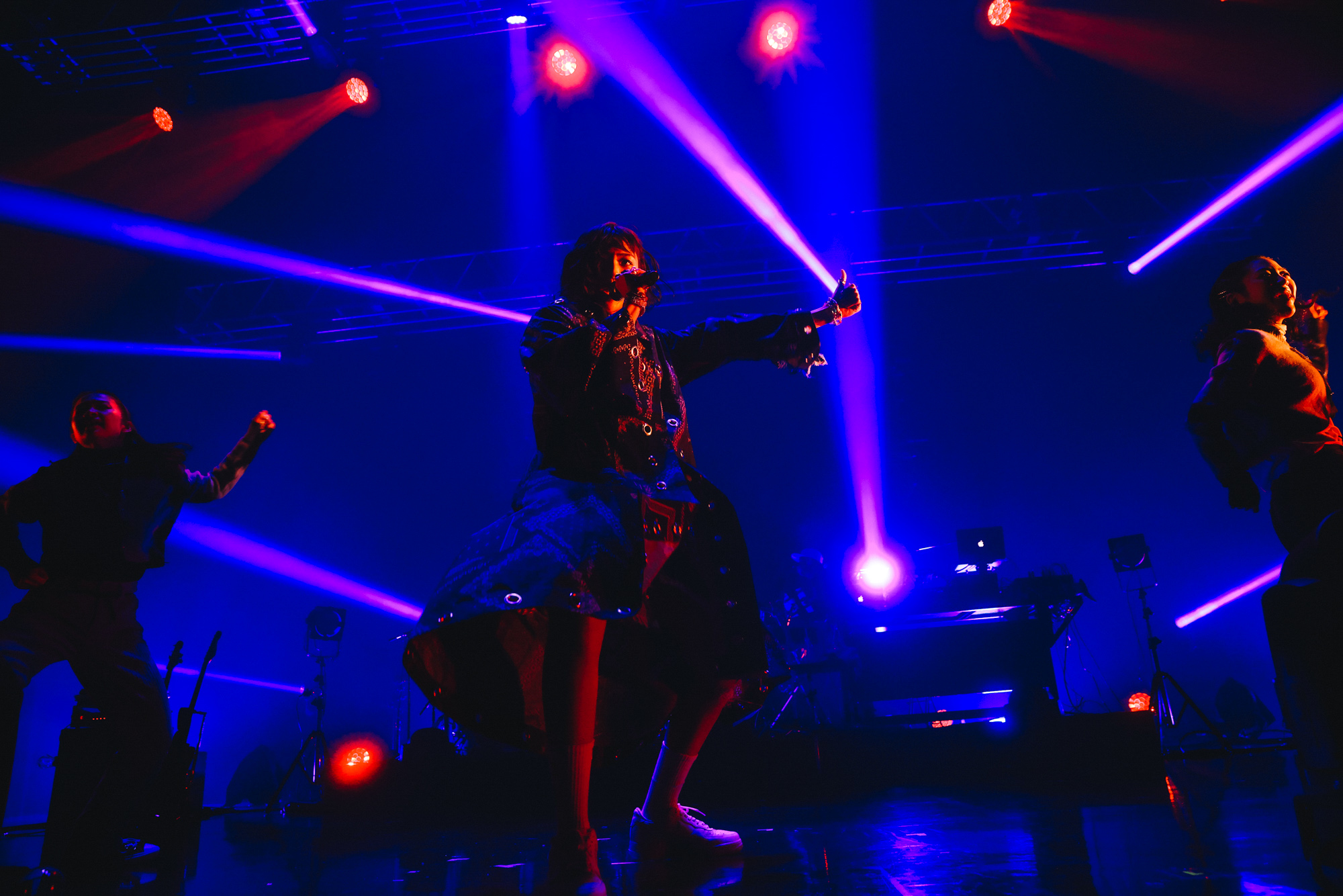 喜びを噛みしめる三阪。「DANNA」で鮮烈な赤いライトに照らされながら大人っぽい表情を見せたかと思うと、「空梅雨」では羽織ったダークカラーコートのフードを目深にかぶって歌声に愁い色をまとわせたり、「Get Stronger」ではフードを脱いで、コートの裾を翻しながらダイナミックにダンスしたり。曲ごとに変幻自在ではないか。