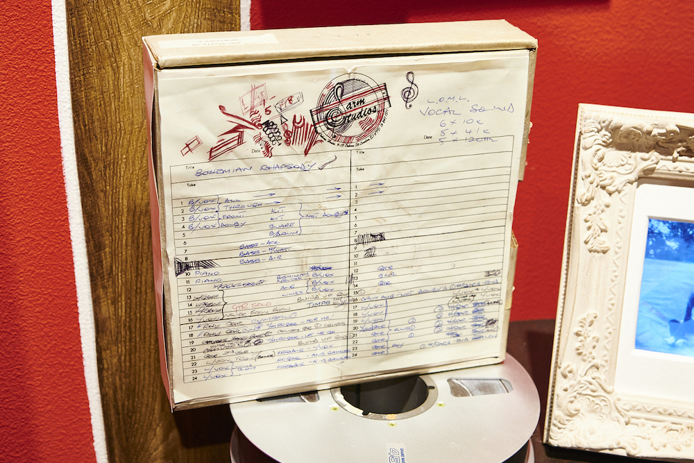 なかでも上野が関心を示していたのは、「ボヘミアン・ラプソディ」の24チャンネルのトラックシート(複製)だ。トラックシートとは、多重録音をする際に各トラックにどのサウンドが入っているかを示すもの。多くのトラックがヴォーカル(VOX)に使用されており、18チャンネルには「ROGER-FOR ME」と書かれている。あの超高音ヴォイスが収録されたチャンネルだと思われる。