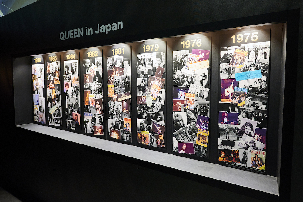 最初は、メンバー4人の生い立ち、グループ結成をたどる展示から。当時、レコード・デビューを目指すバンドにとっての登竜門だったライブハウス「マーキー・クラブ」の様子、75年に初来日したときの資料など、クイーンがたどる道を追体験していく。