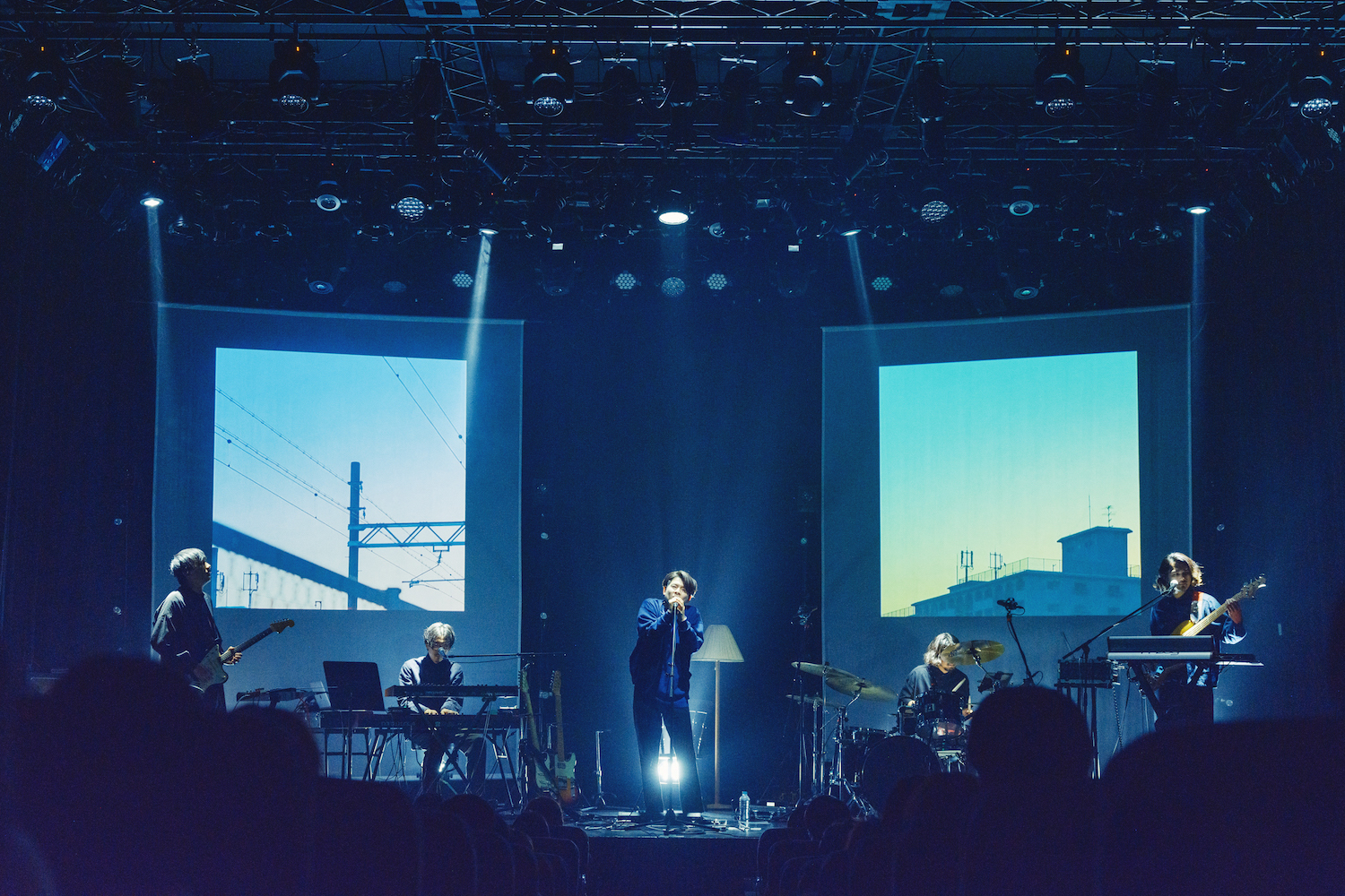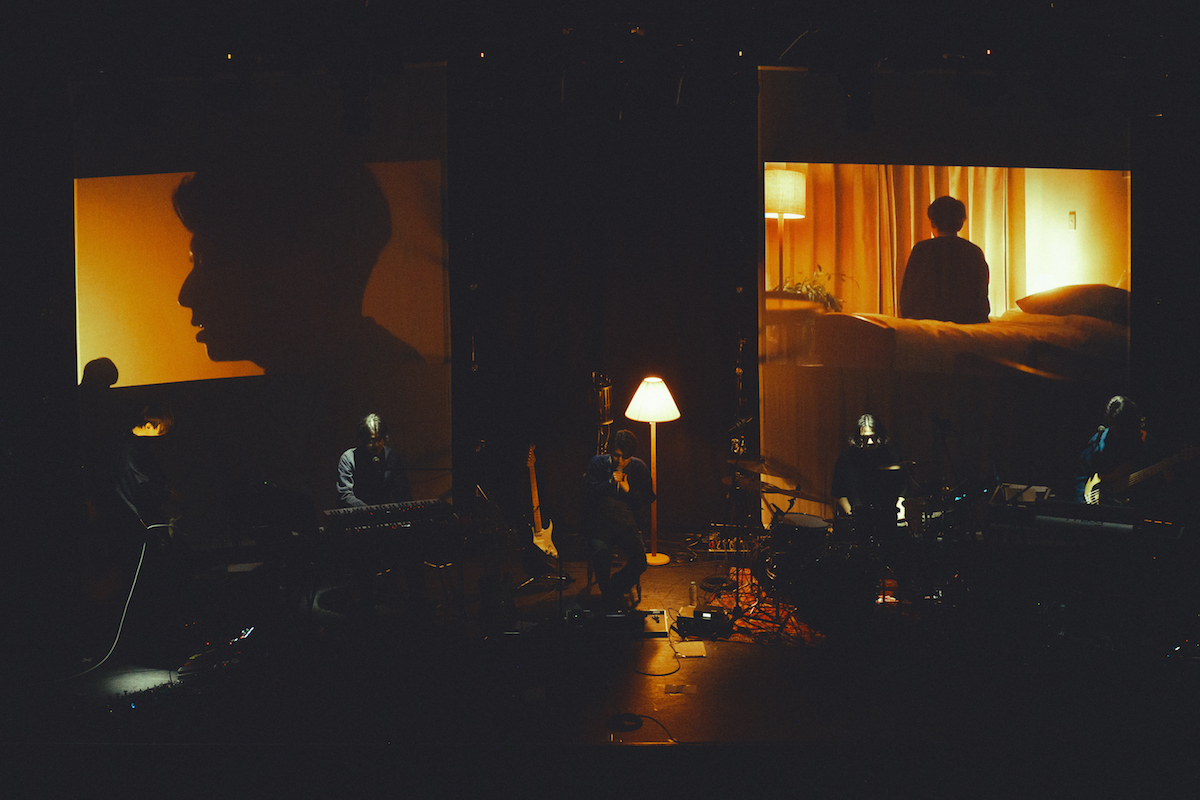 ステージ上は楽器こそ多いもののすっきりと横一列に並んだスタイルで、背景に2面のスクリーンが垂らされている。前回までの紗幕に囲まれた箱状の物体はないが、スタンドライトと椅子は残されている。開演までの時間を緩やかに変化する色と森山公稀(Pf/Syn)作のインストがループする。メンバーが登場するとイマジネーションに富み、ひたひたと迫るようなインストがしばし続き、椅子に座ったミゾベリョウ(Vo/Gt)が歌い出すと、スクリーンにはピンホールの円が拡大していくような映像が投影される。いわゆるギターサウンドのイメージを凌駕していくスタイルの西田が後半に向かって呻きのような音を奏で、静謐なのにカオティックな空間を醸成。Shaikh Sofian(Ba)のシンセベースも会場を震わせる。一転、森山のピアノが導く「独り」では左右のスクリーンの左はミゾベの横顔、右にはベッドに腰掛けた後ろ姿を投影。その映像の中央で生身のミゾベが歌う構図も面白い。