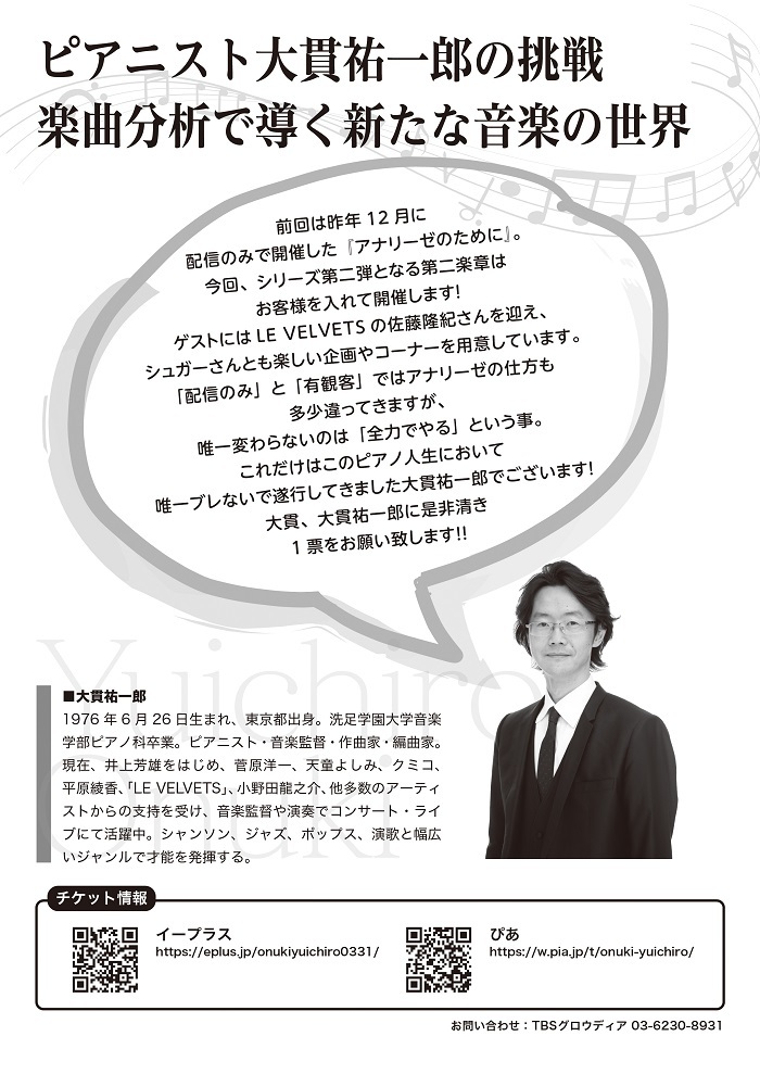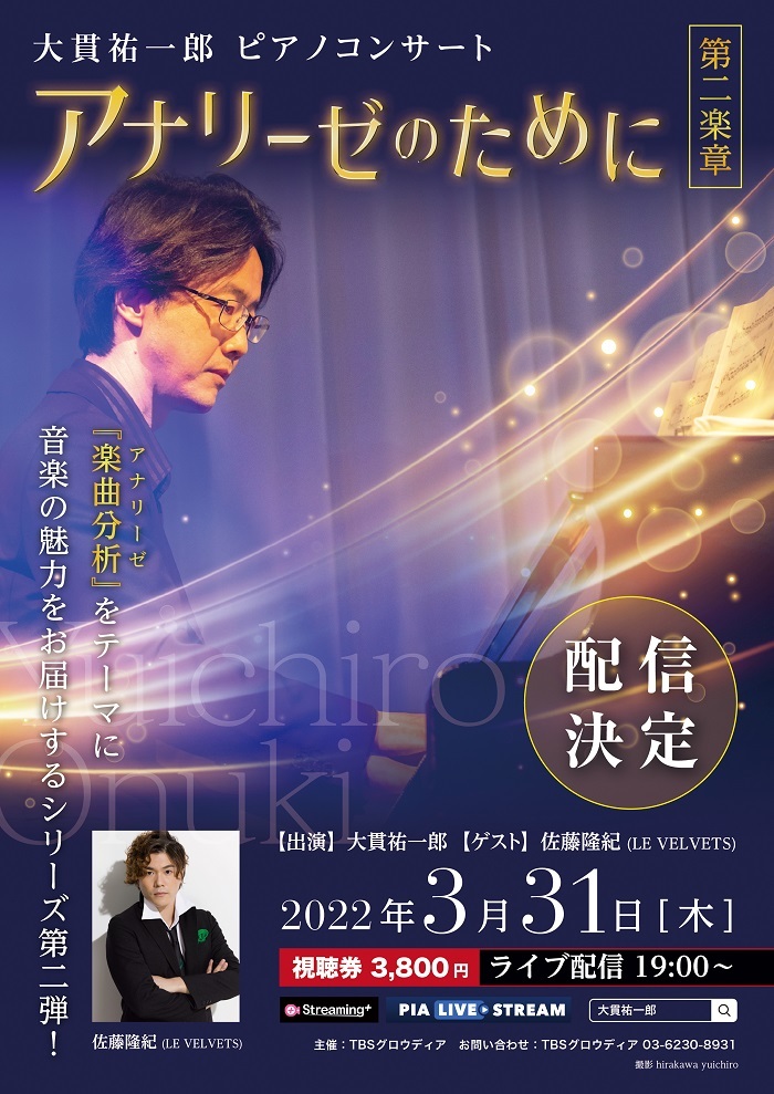 2022年3月31日(金)に開催される大貫祐一郎 ピアノコンサート『アナリーゼのために 第二楽章』のライブ配信が決定した。
